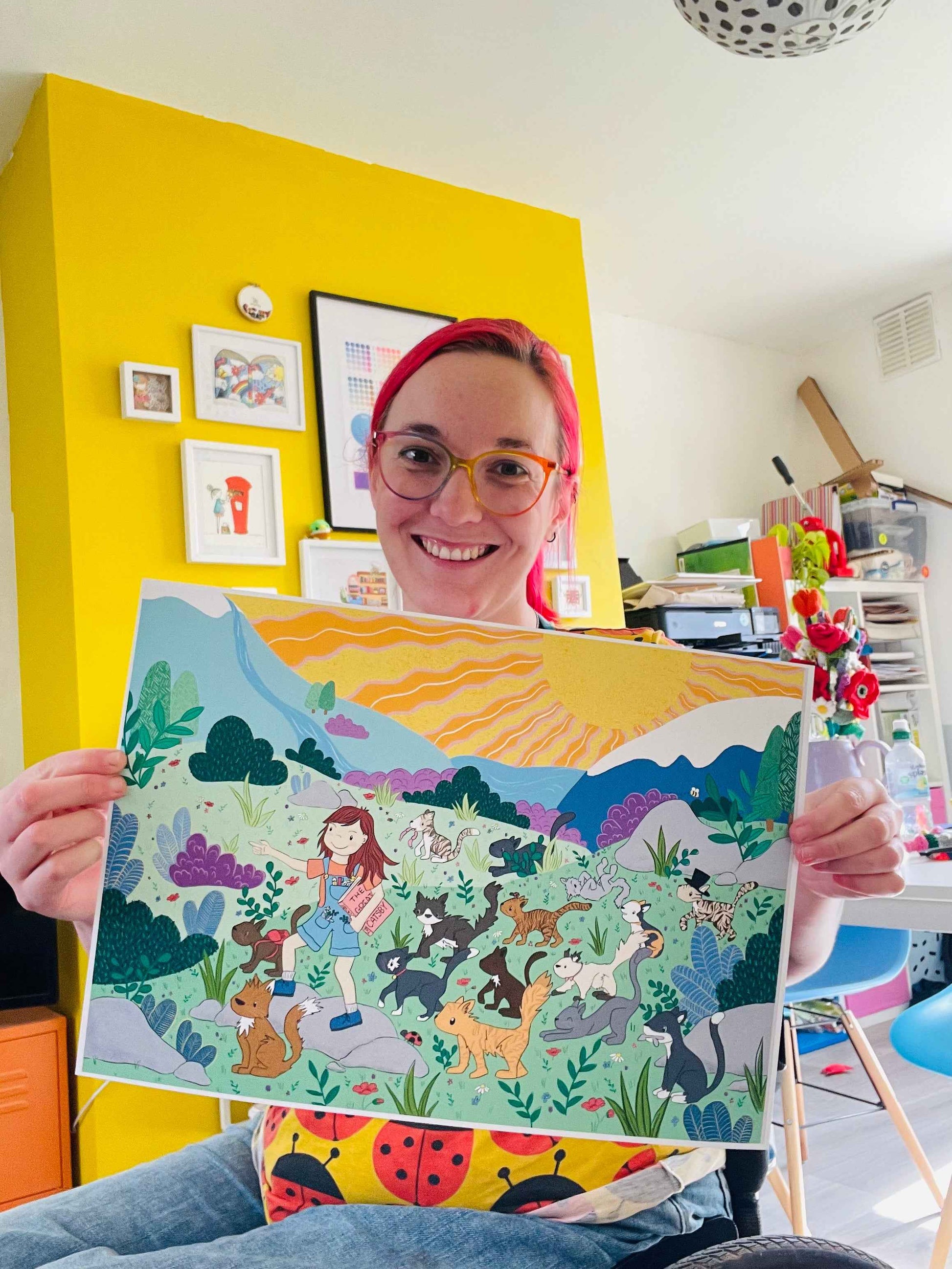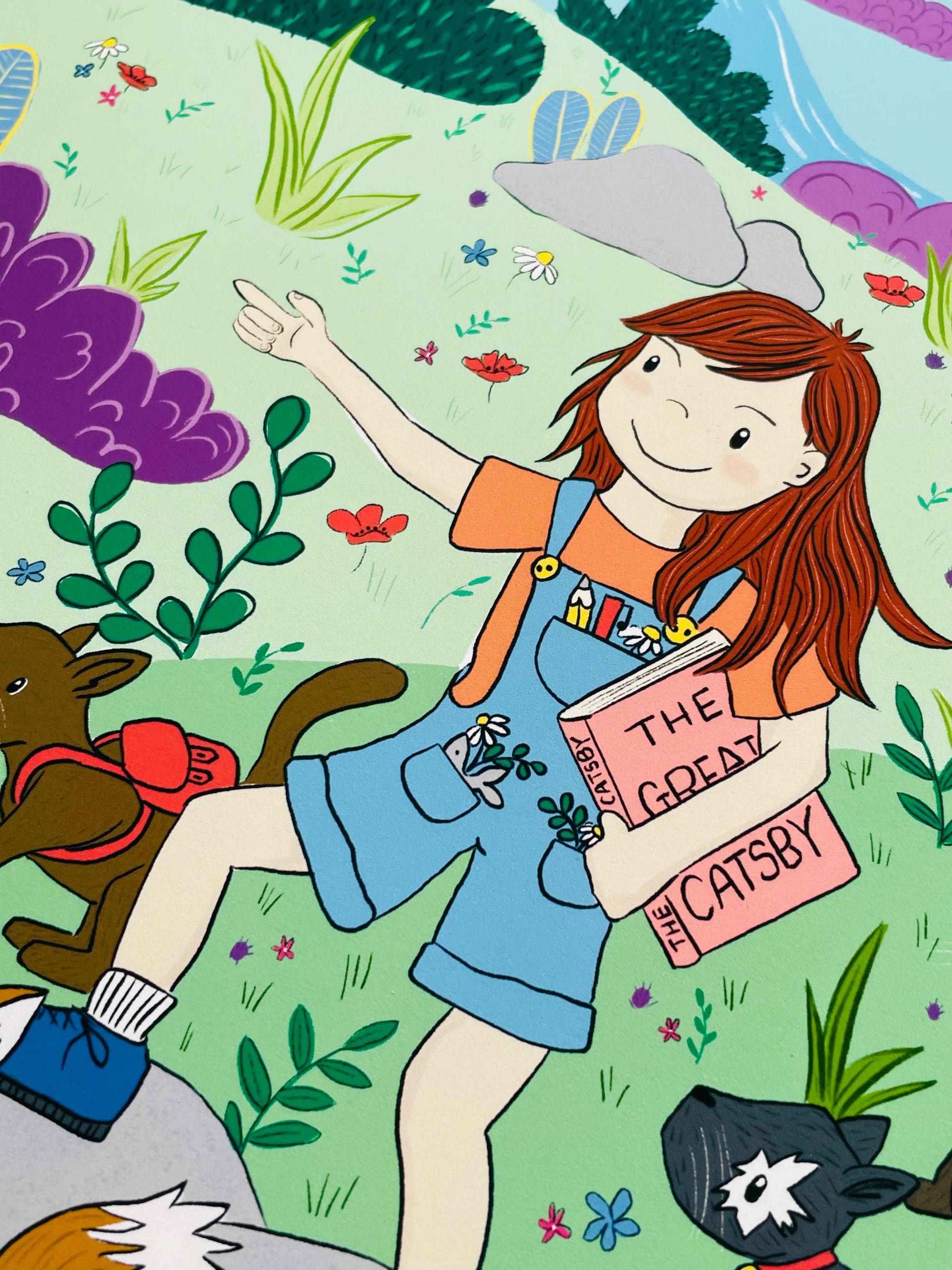 A quest awaits this adventurous girl and her cats. Armed with a book, a pencil and a few fish for the journey she is ready to begin her journey.