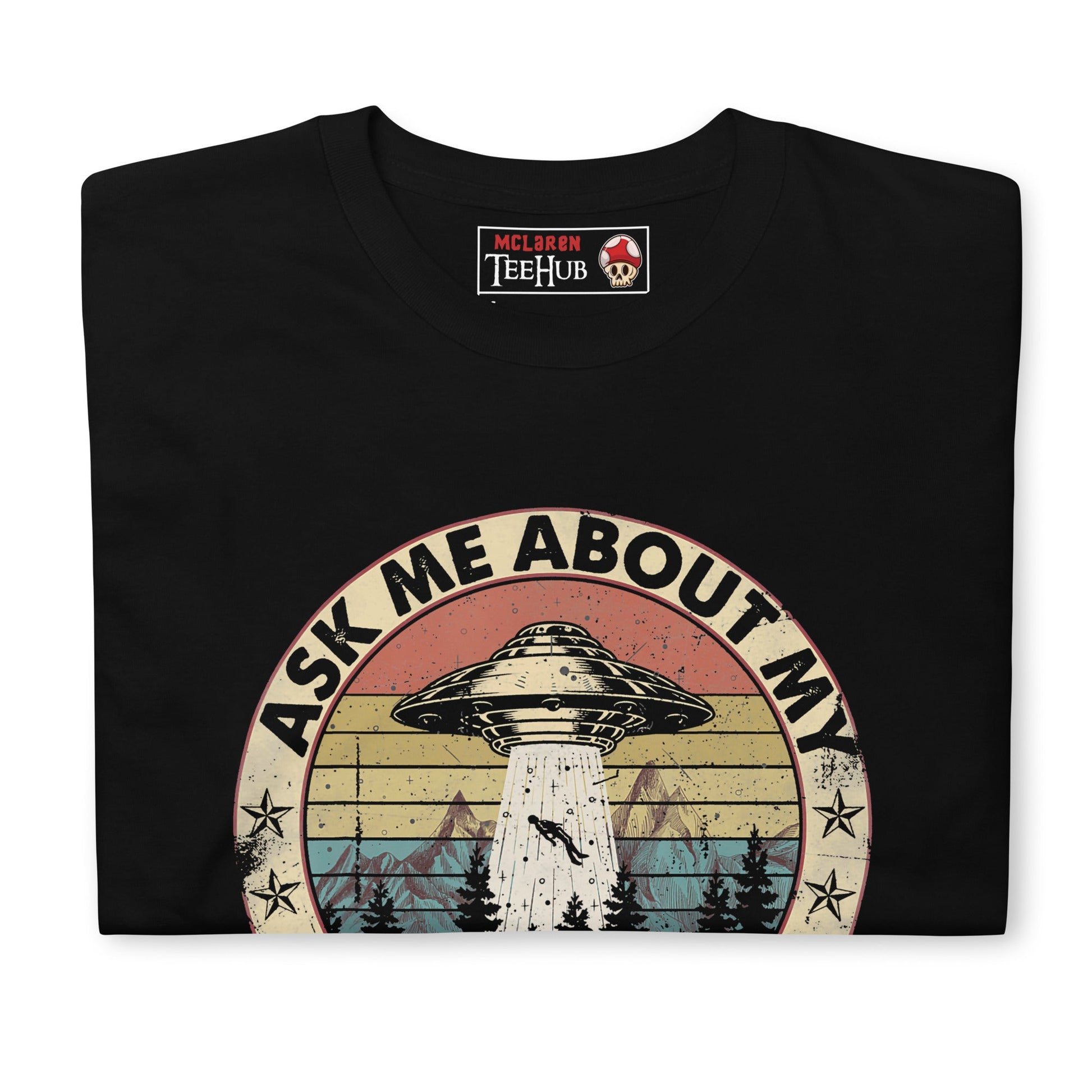 Elevate your style with our hilarious alien abduction T-shirt, designed to turn heads and ignite laughter. Featuring a fun graphic of a UFO abducting a human silhouette, this tee stands out with the cheeky phrase "Ask me about my butthole." It's the ultimate conversation starter for those intrigued by extraterrestrial encounters and looking for a unique statement piece. Perfect for anyone who loves a good laugh and a touch of the extraterrestrial, grab yours today and let the abduction begin!