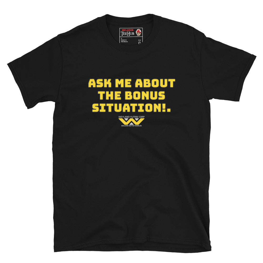 If you're a fan of the classic 1979 space horror Alien, then this t-shirt is perfect for you! Featuring the iconic quote "ask me about the bonus situation" from the intense scene in the movie, this tee is a must-have for any fan of the franchise. Made from high-quality materials, this t-shirt is comfortable and durable, perfect for wearing to your next sci-fi convention or screening party. With bold type and attention-grabbing design, this tee is sure to turn heads and make a statement. So why wait? Grab yours today and show off your love of all things Alien!
