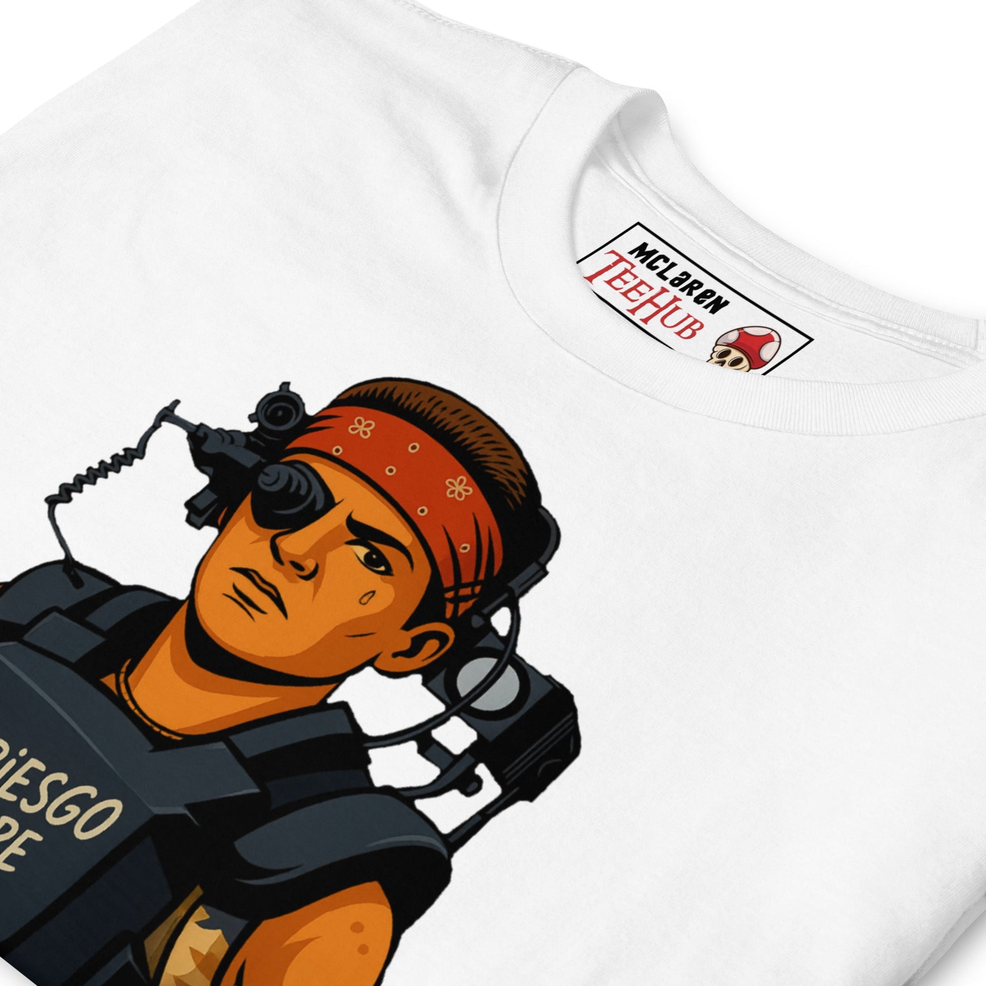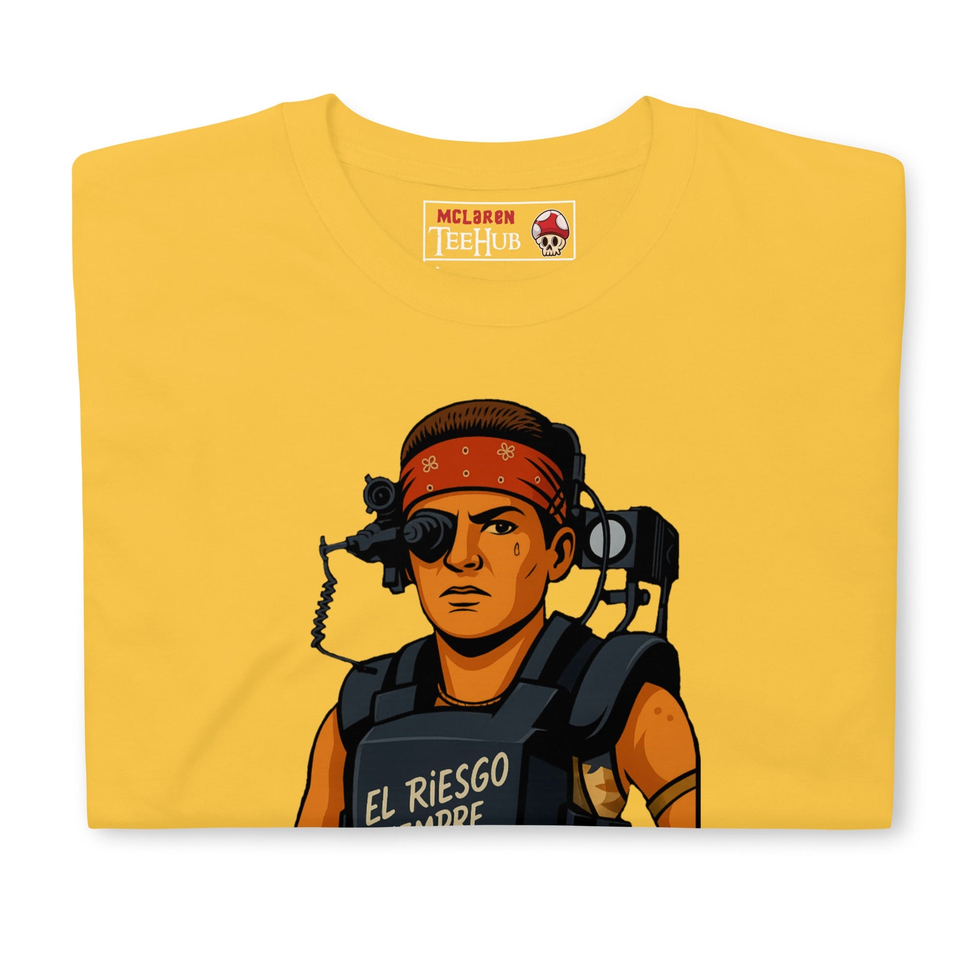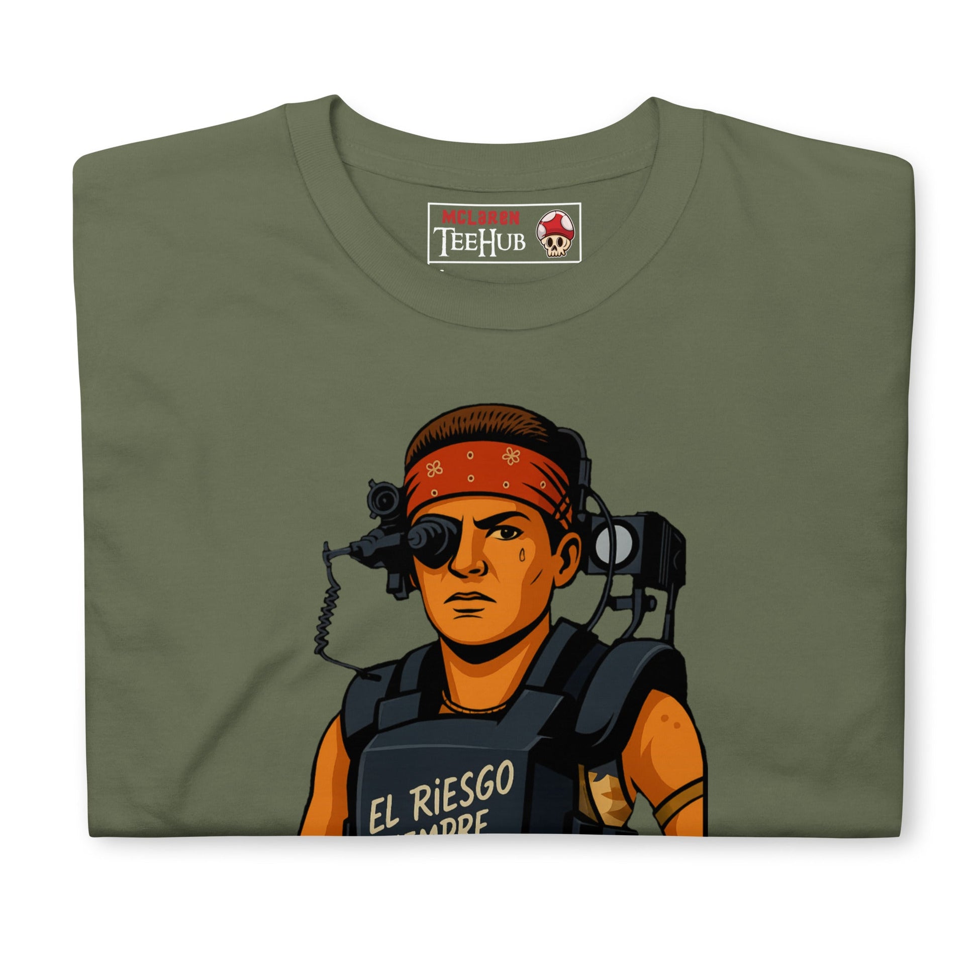 Gear up like the toughest Colonial Marine in sci-fi history with our Aliens Colonial Marines Vasquez T-Shirt. Inspired by Jenette Goldstein’s iconic portrayal of Private Vasquez in James Cameron’s 1986 classic Aliens, this graphic tee features a bold cartoon-style design of Vasquez in her battle armor, complete with her signature red bandana and the legendary phrase “El Riesgo Siempre Vive” across her chest plate.