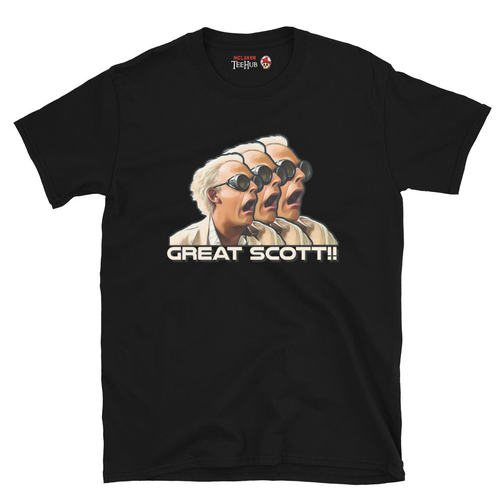 Relive the magic of the 1980s classic Back to the Future with this iconic Doc Brown T-shirt. Featuring the unforgettable 'Great Scott' quote, this shirt is a must-have for any fan of the beloved film. Perfect for movie enthusiasts and 80s nostalgia lovers, this T-shirt is sure to stand out in your wardrobe. Get yours today and make a statement with this timeless piece of pop culture history!