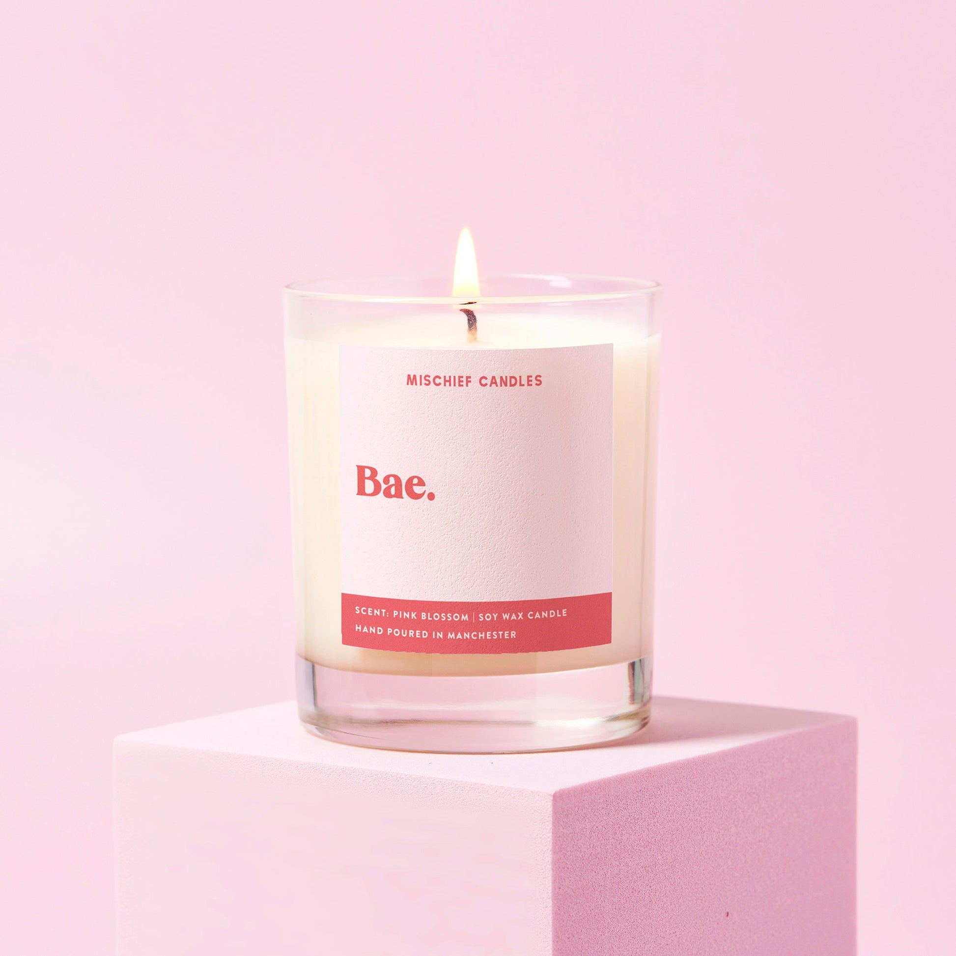 A funny candle gift for a friend that you put before anyone else. The message on the candle reads, 'Bae’ in our signature bold red font on a pale pink label.