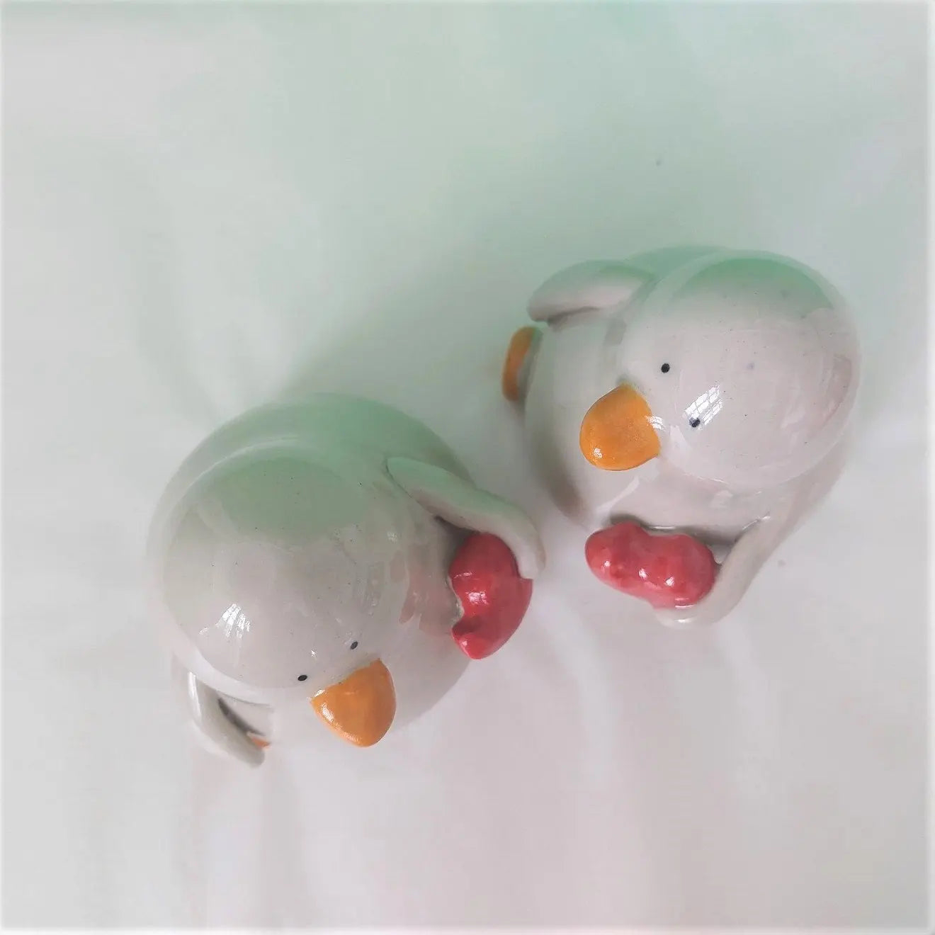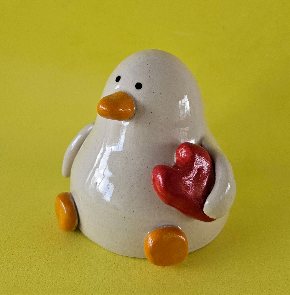Handmade from wheel-thrown white stoneware clay, with hand-built ducky features and heart, underglazed, biscuit fired then transparent glazed and fired to stoneware 1220'c. At this temperature the glaze becomes glossy and smooth and you're left with a new ceramic companion.