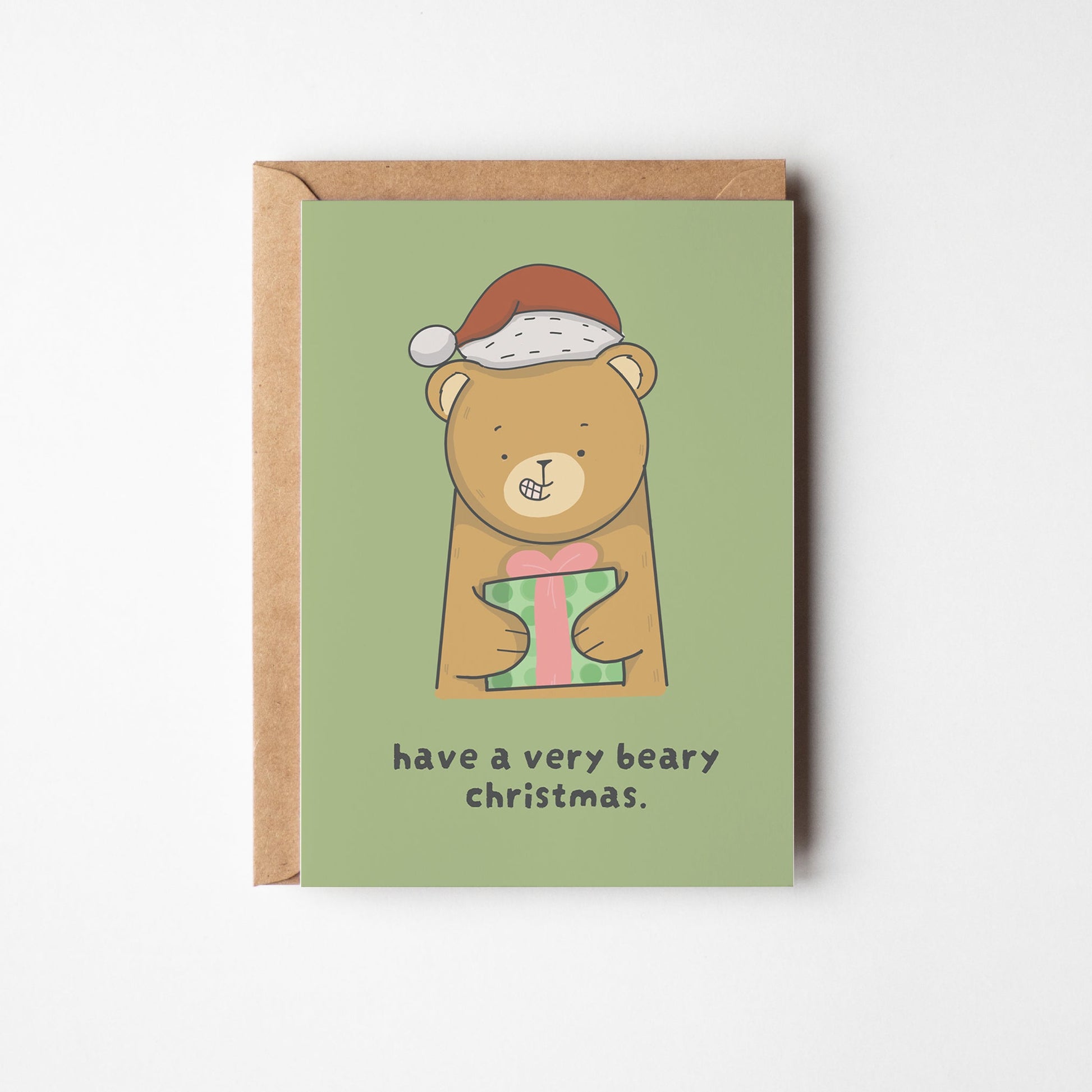 Featuring a bashful bear in a Santa hat holding a green present (with a very good bow), this kawaii festive friend is here to bring warm fuzzies and seasonal cheer — the pun is just a bonus with adorable cuteness! Perfect for friends, family, coworkers, or anyone who deserves a hug in card form this holiday with kawaii magic! ✨
