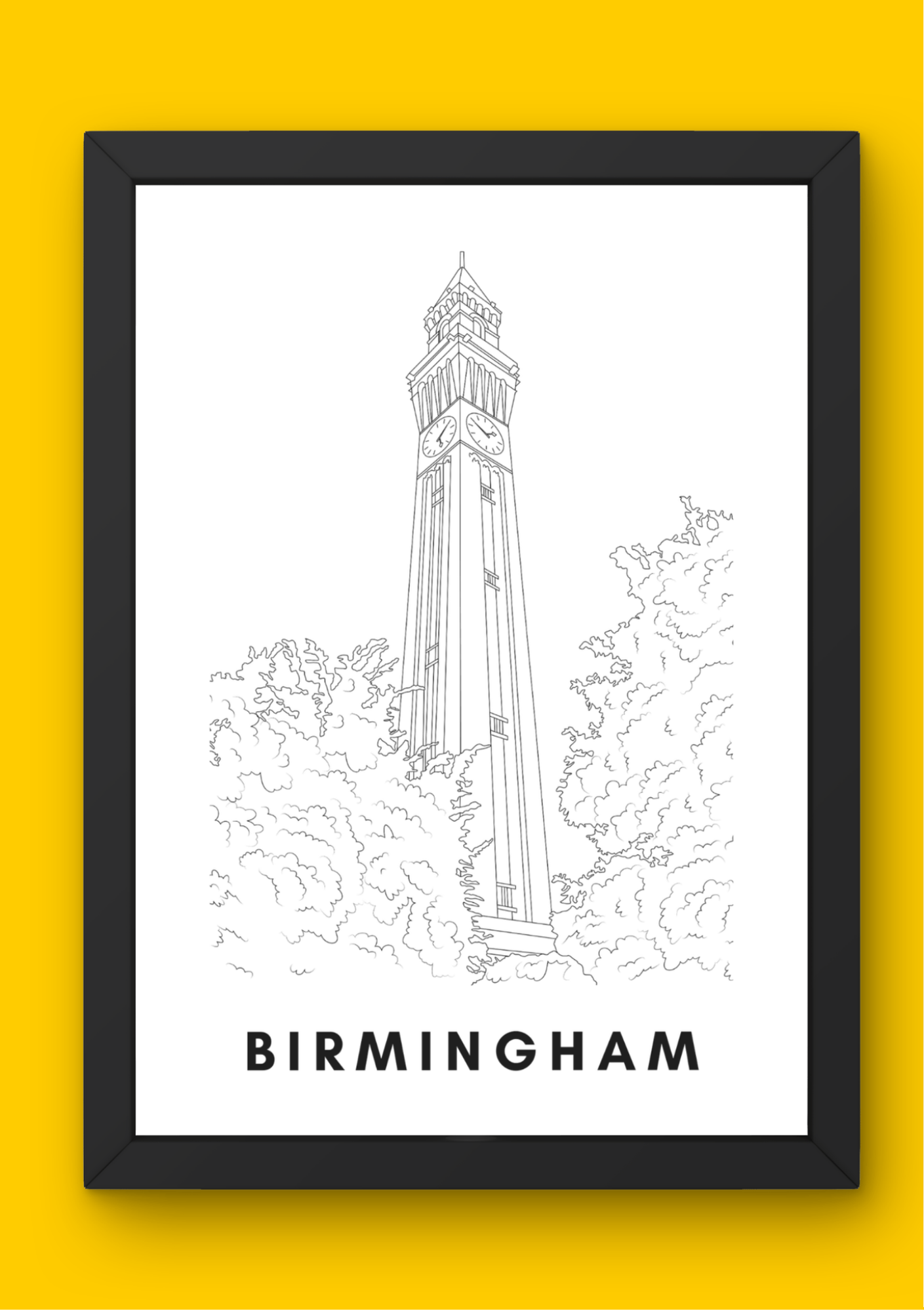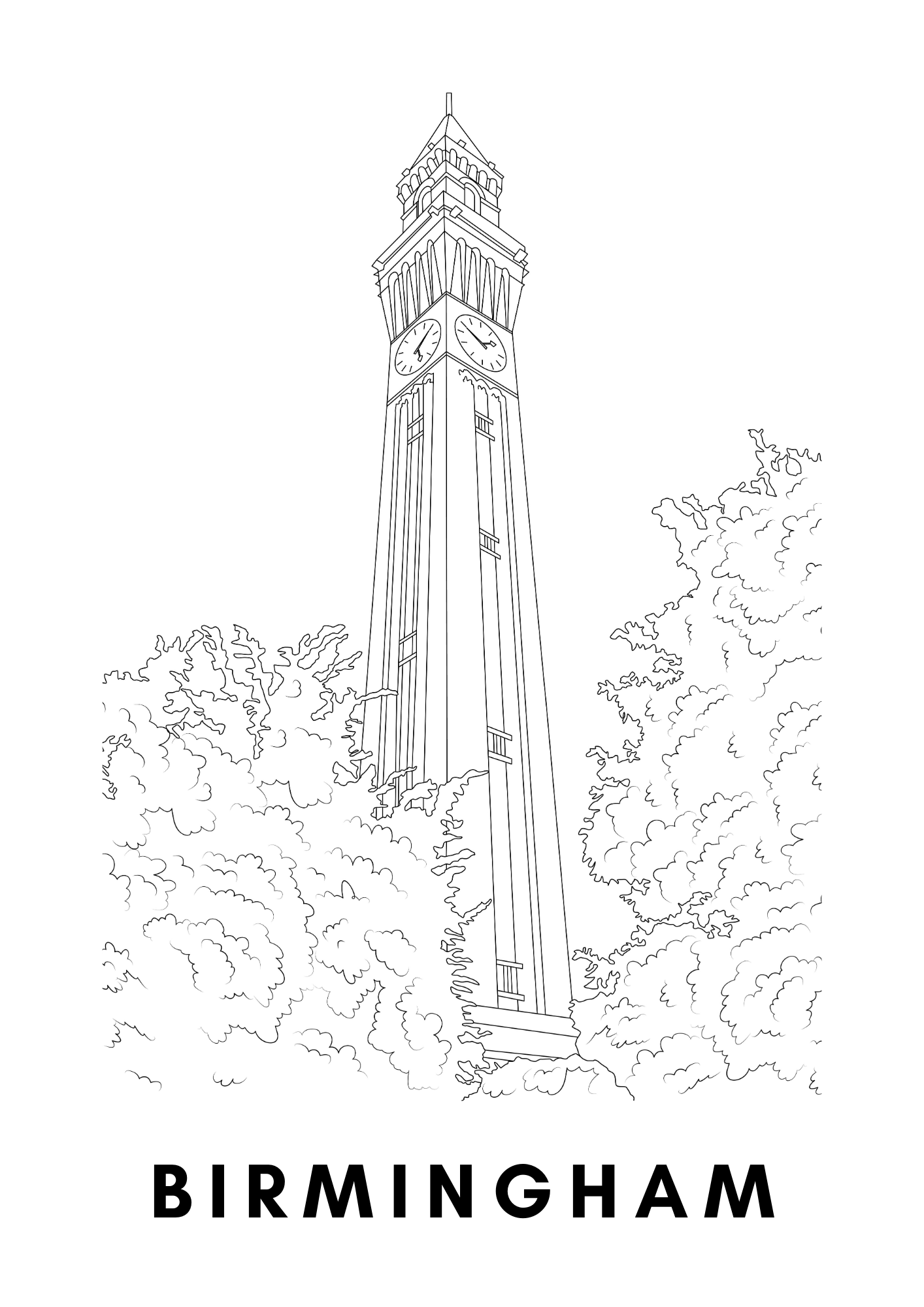 Beautiful wall art / poster of the Chamberlain Clock Tower, University of Birmingham in Birmingham. The poster can be left as is, or coloured in as preferred.