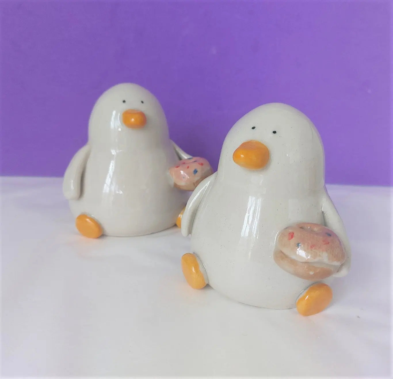 Duncan is 100% handmade from start to finish. He is made from wheel-thrown white stoneware clay, added ducky features and doughnut, underglazed, biscuit fired and transparent glazed then glost fired to stoneware.