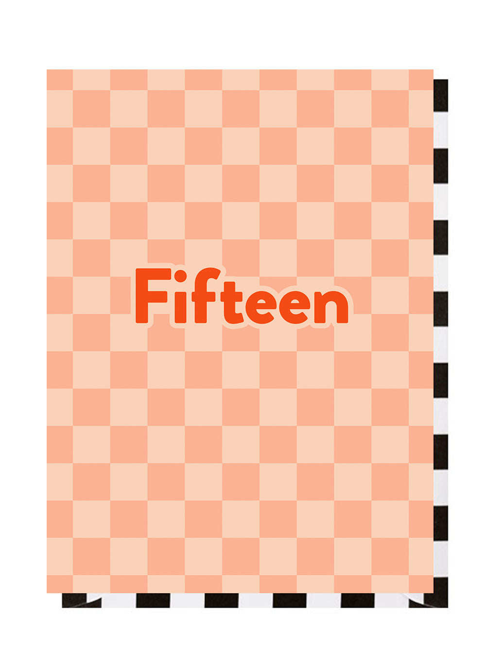 A fun checkerboard 15th birthday card with the word 'Fifteen' on the front.