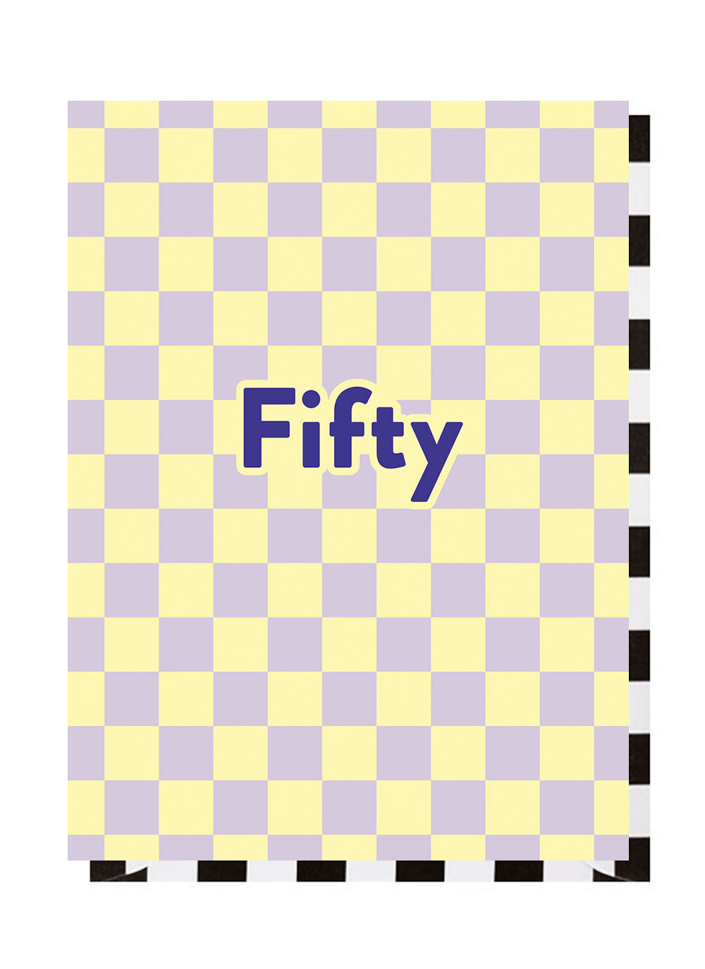 A bright checkerboard 50th birthday card with the word 'Fifty' on the front.