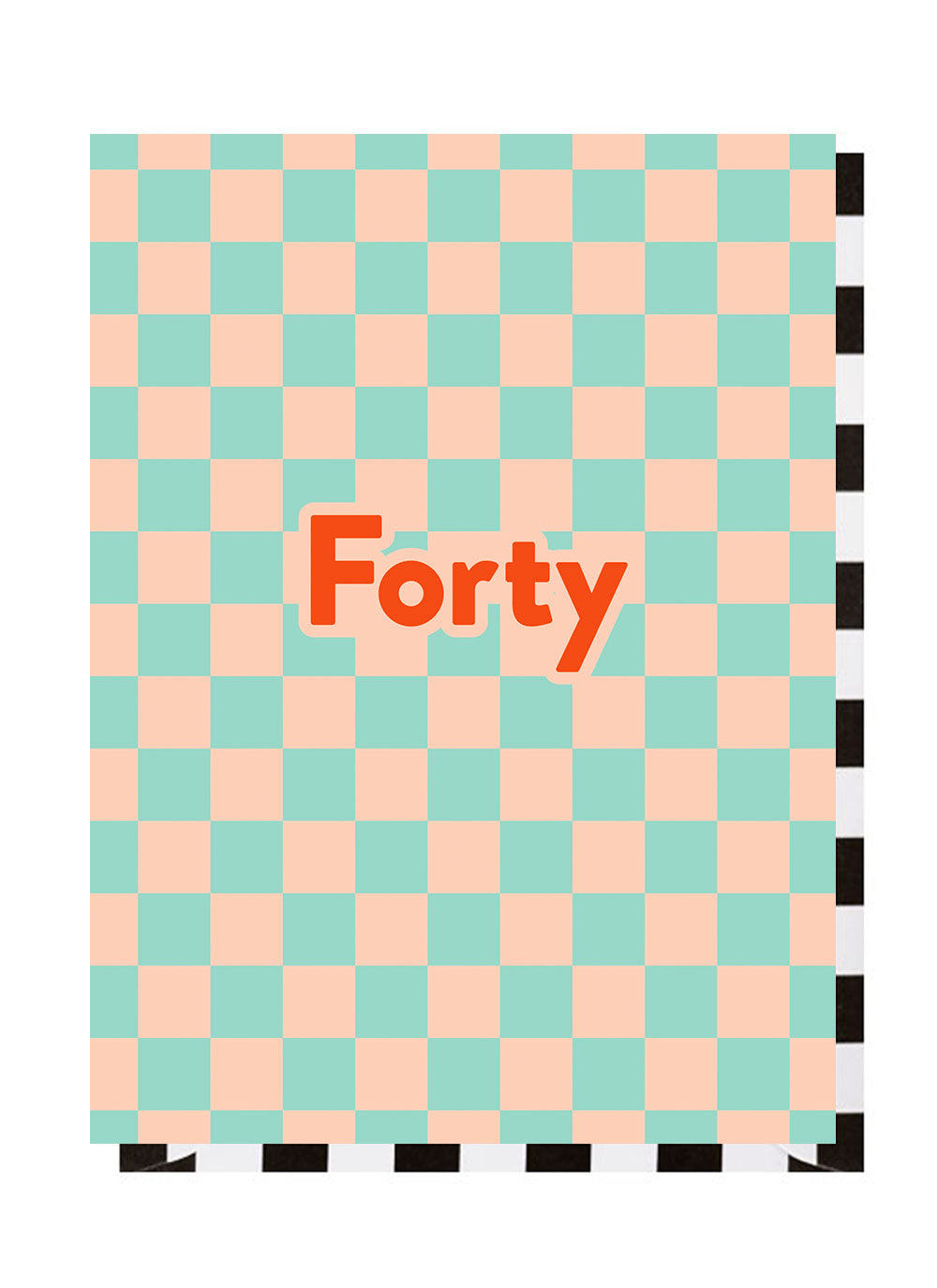 A lively checkerboard 40th birthday card with the word 'Forty' on the front.