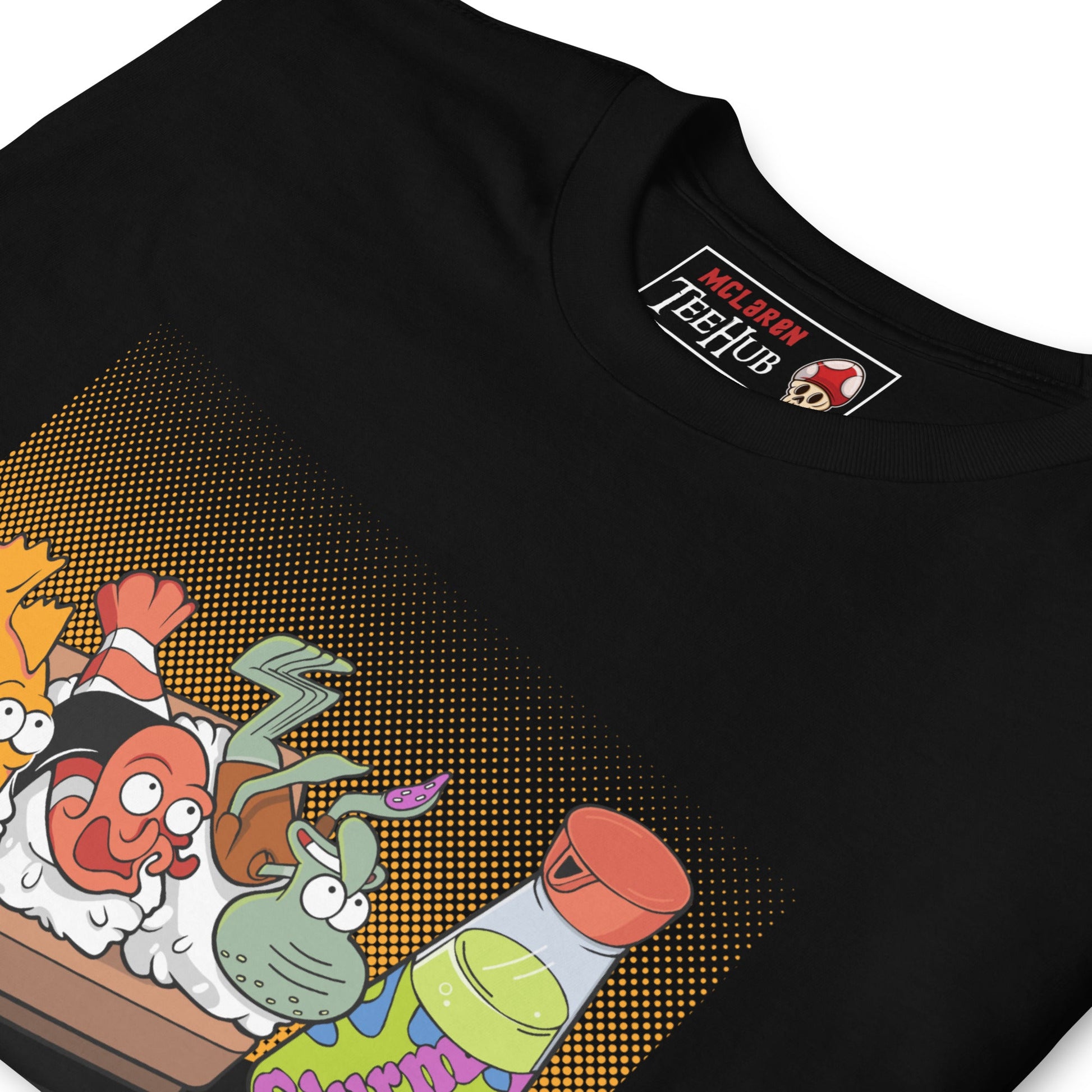 Discover our Futurama Sushi T-shirt, a unique addition to your sci-fi apparel collection! This graphic tee showcases the main characters from the iconic Futurama series, cleverly reimagined as sushi. Ideal for fans of anime and science fiction, this shirt is a conversation starter. Wear your love for Futurama proudly and boost your style with this standout piece of Futurama merchandise. Get yours now!