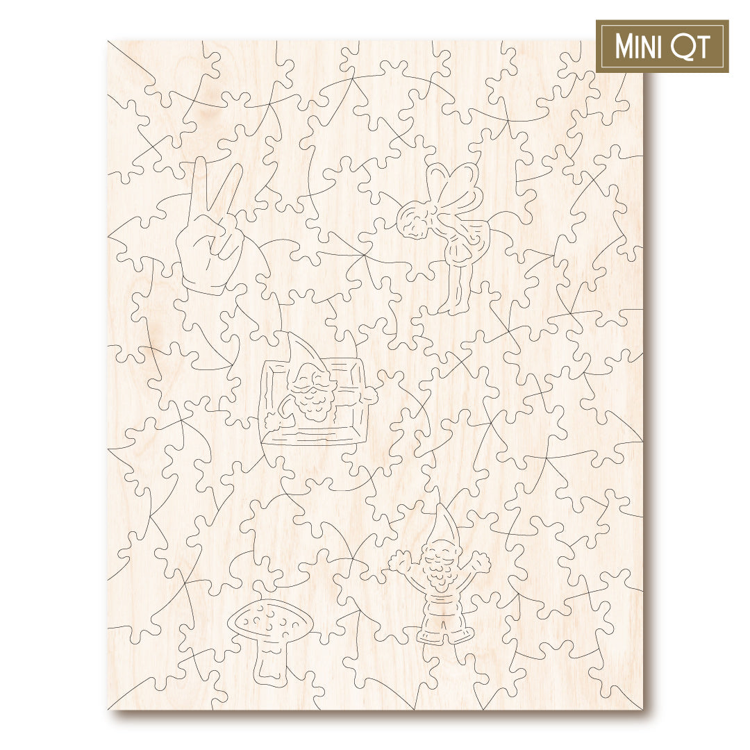 Our MINI QT puzzles are laser cut from thick, 4mm plywood and include 5 whimsies - they make a great puzzle snack!