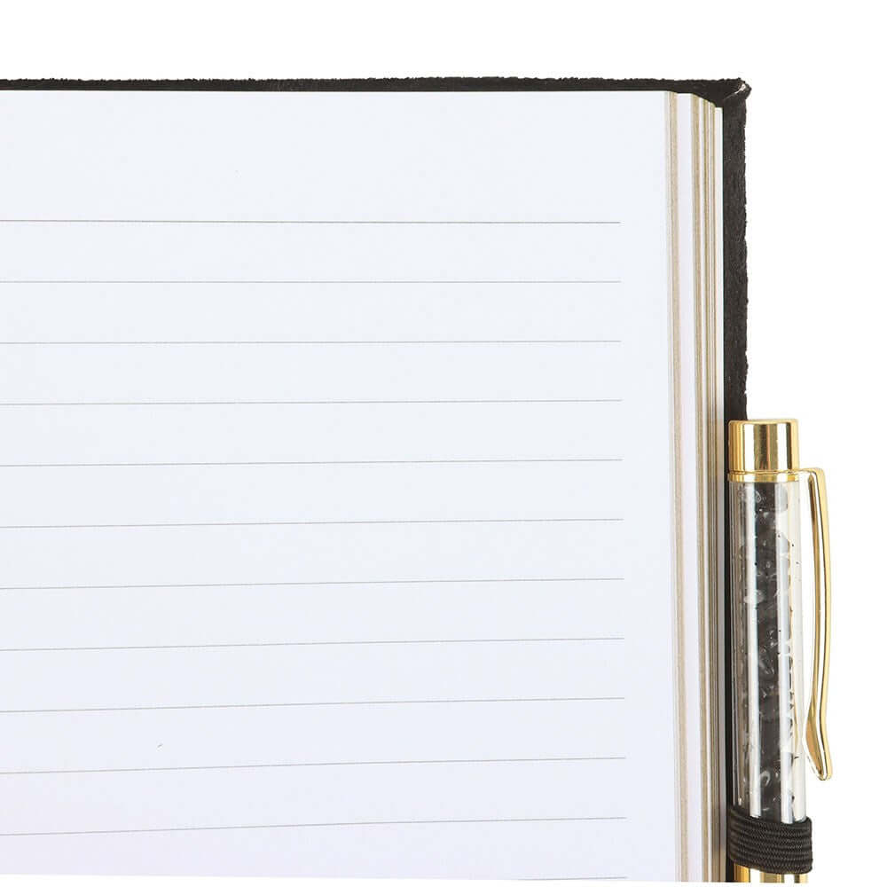 This Book of Shadows journal is perfect for recording spells, rituals, and mystical insights. The cover is adorned with mystic, metallic gold details and it comes with a sleek black obsidian crystal pen known for its protective and grounding abilities. With 200 lined pages (100 sheets), this journal is a part of the Wands and Witchcraft range of magical stationery and accessories.