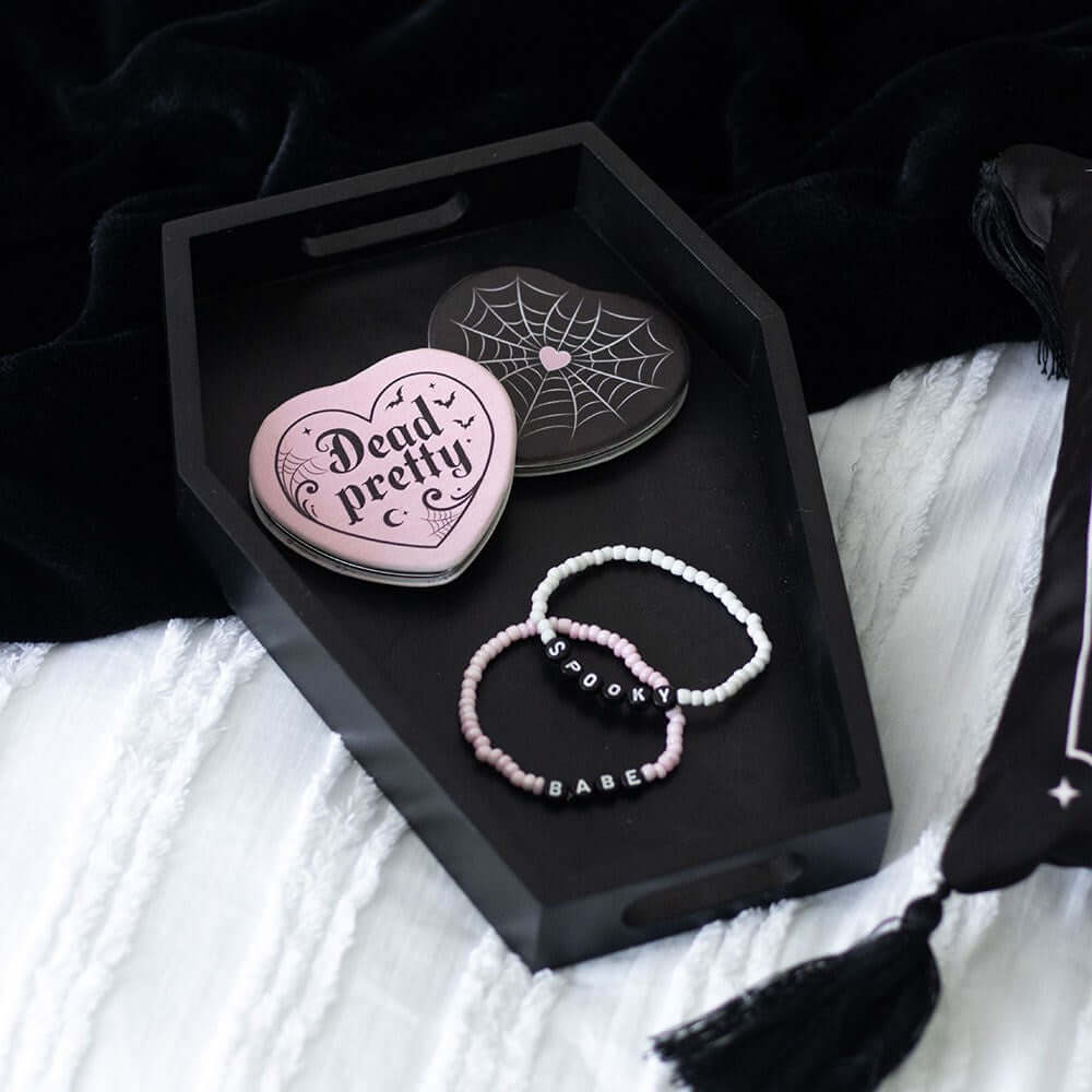 Bring some spooky vibes to your home with this coffin-shaped tray made of black MDF. Perfect for showing off candles, drinks, or trinkets, it's a standout addition to any stylish and eerie space. Part of the Pretty Deadly collection of girly goth goodies and gear.