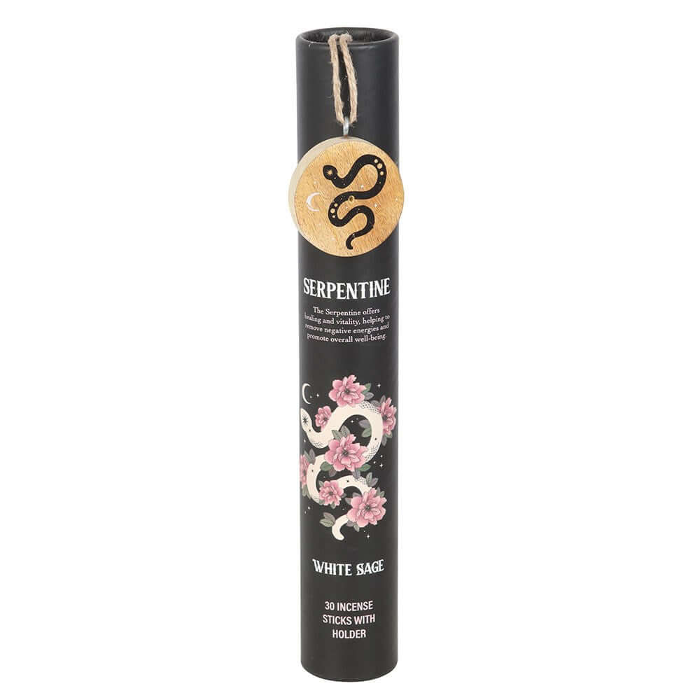 This Serpentine Incense Stick Set features a striking Serpentine design and includes 30 sticks of white sage incense. Each pack also comes with a convenient wooden incense holder, making it a considerate gift. It is part of the Serpentine collection, known for its floral snake-themed gifts and accessories.