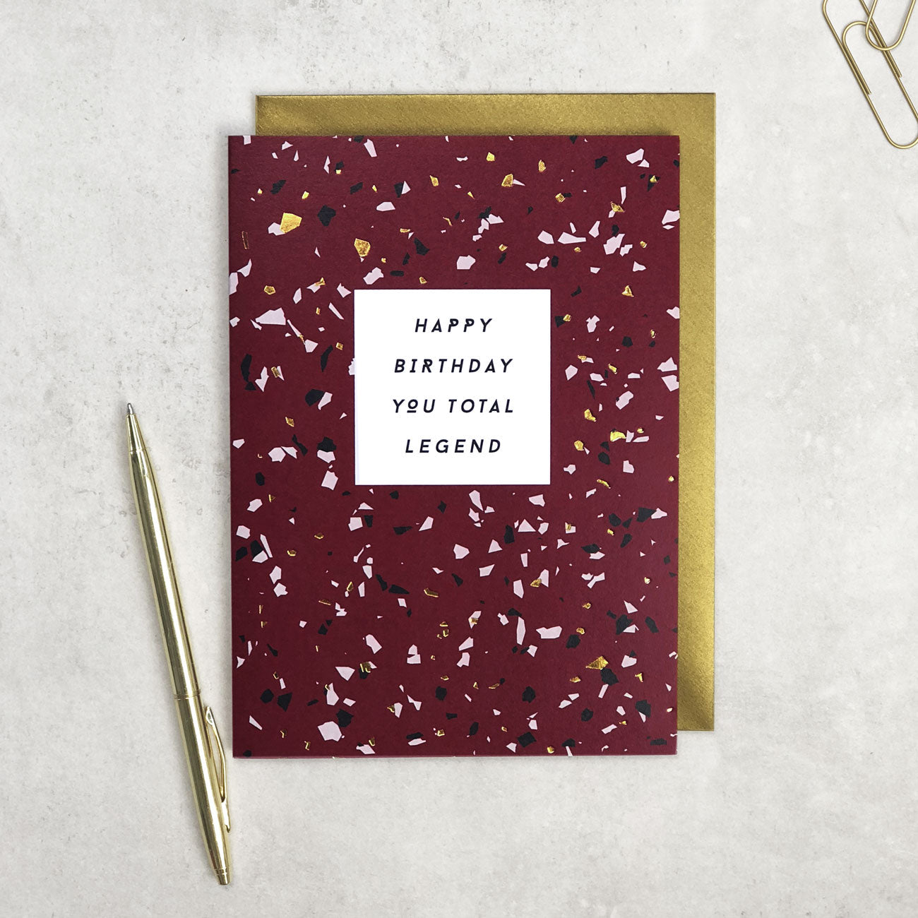 This cool birthday card has a burgundy background with a stylish terrazzo print, complete with gold flecks.