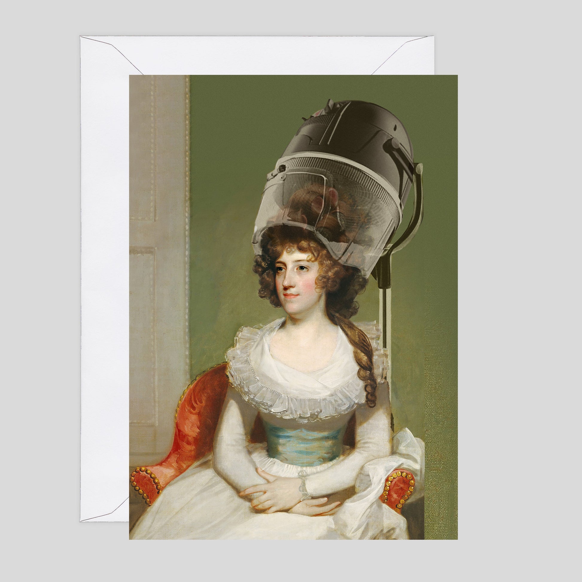 As the woman sat beneath the peculiar contraption, she couldn't help but ponder if her elaborate curls would defy the laws of time and fashion, catapulting her straight into the pages of history as the first-ever hair-drying trendsetter of her era.