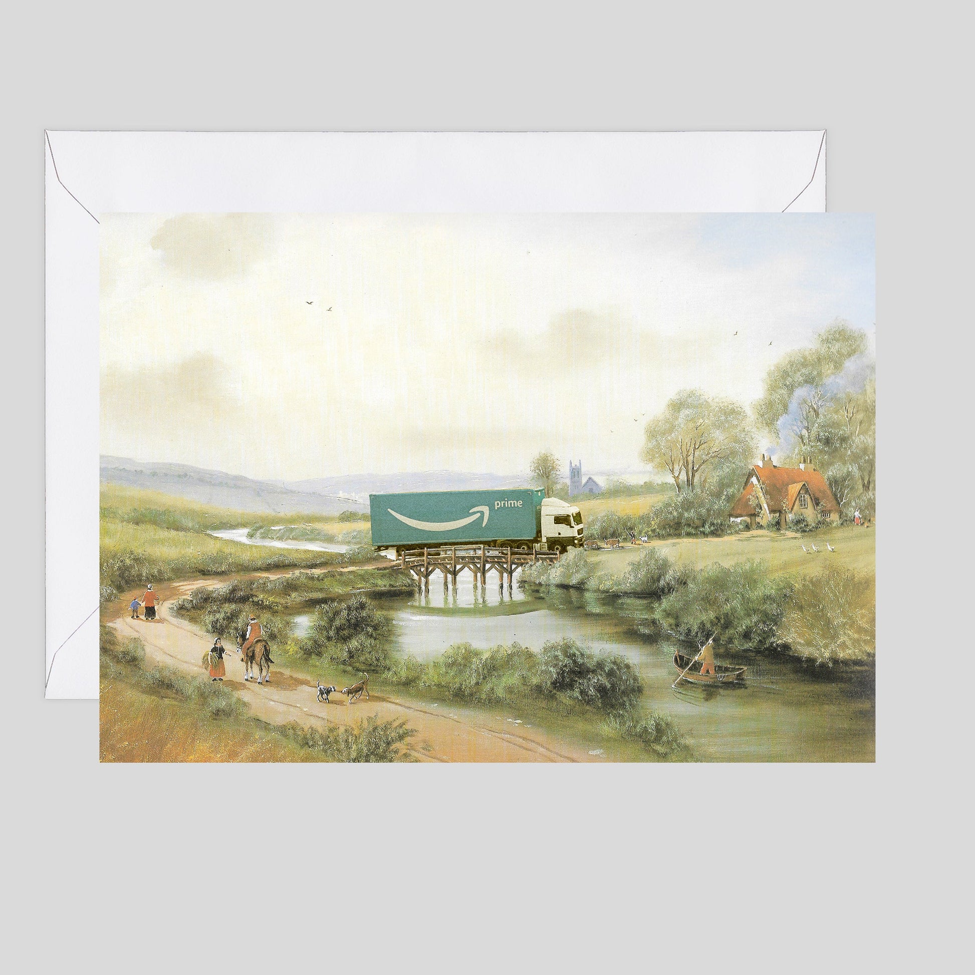 In a classical English landscape of two centuries past, an Amazon lorry boldly traversed a historic bridge, causing the local villagers to gasp in disbelief and question if this was the mythical "carriage of wonders" delivering everything from quills to pocket watches at unimaginable speeds.