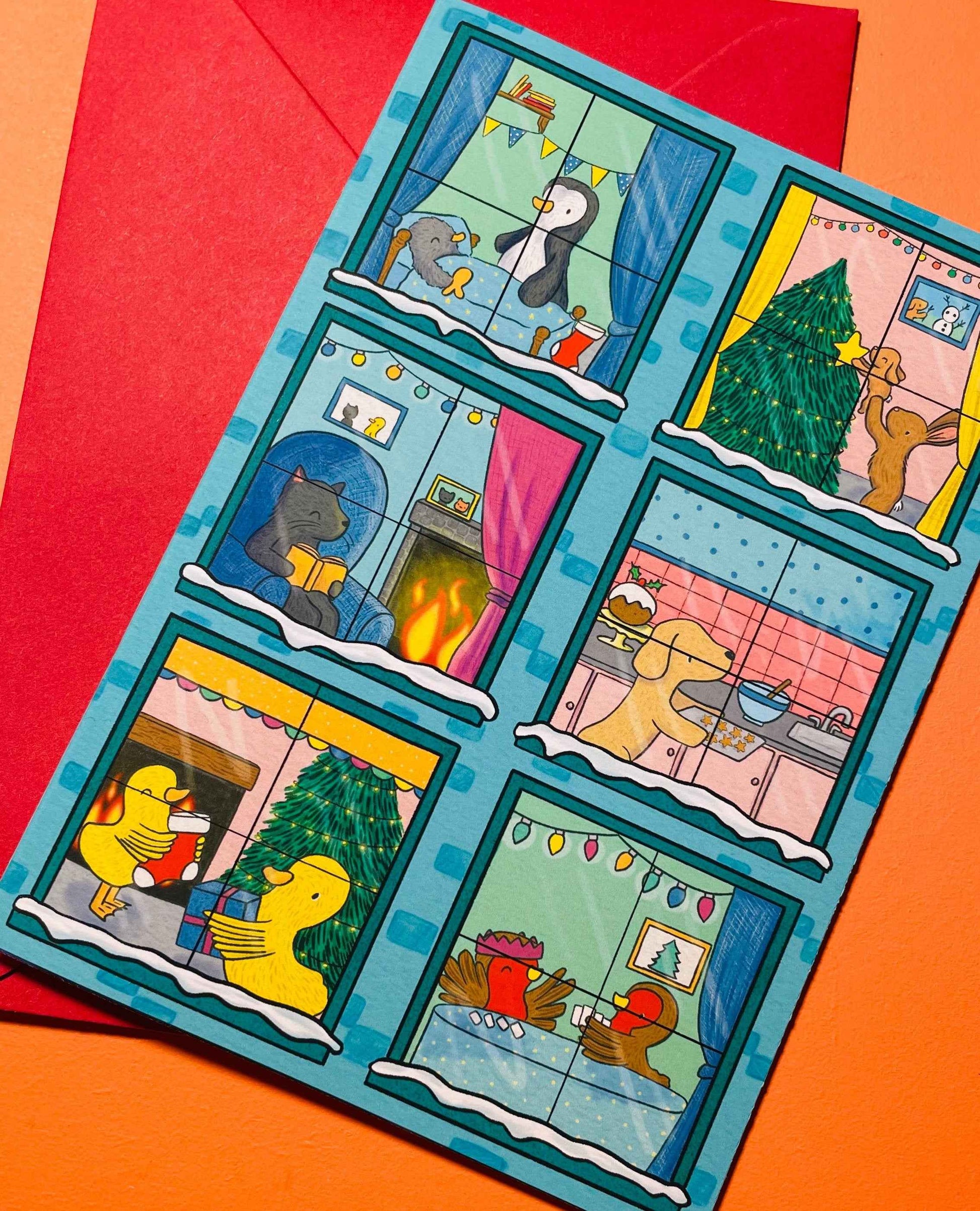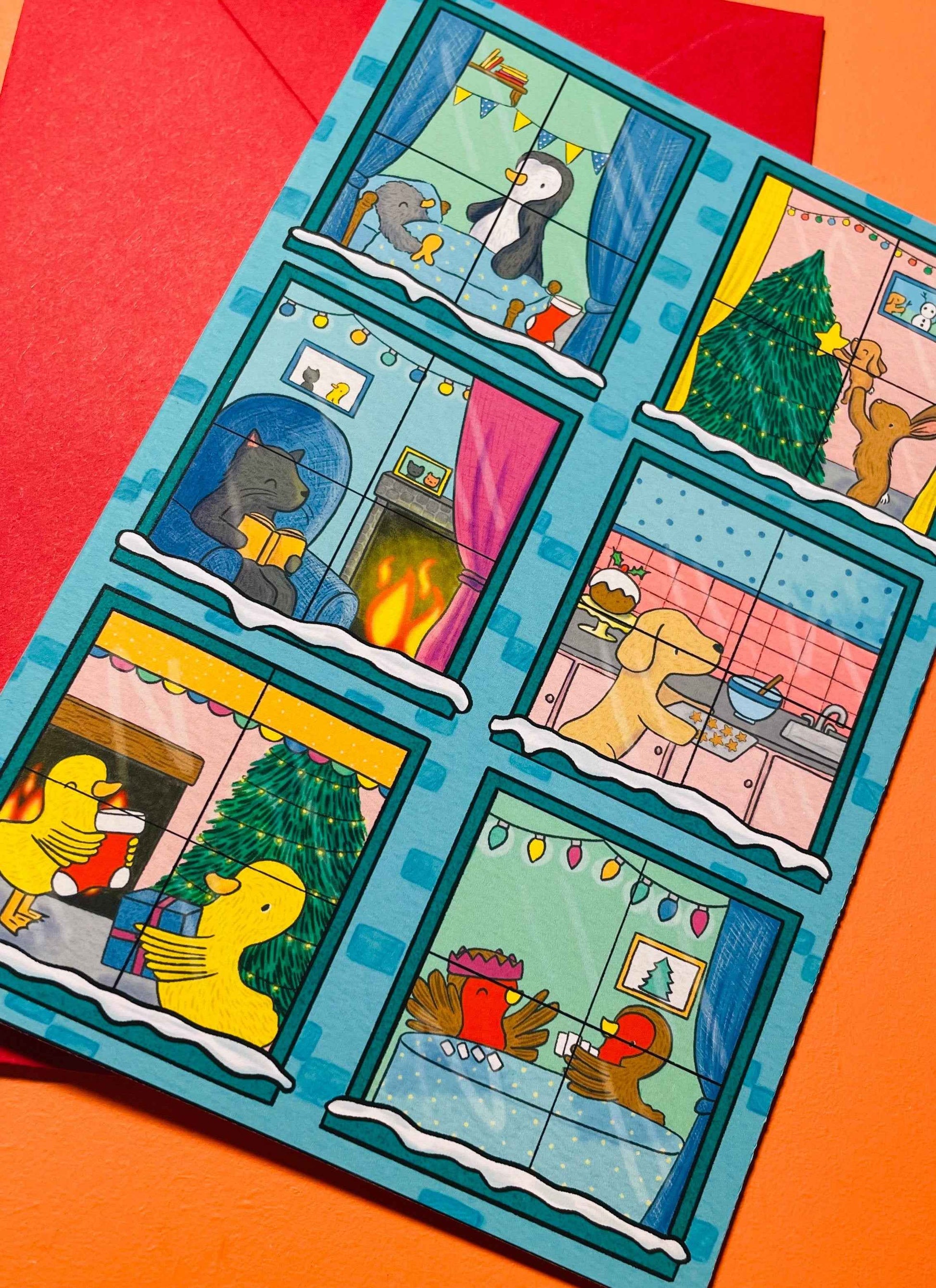 Illustrated to look like a building, each window gives you a peek into the homes of six different animals lives. There is a family of bunnies decorating their tree, penguins getting ready for bed, a cosy kitty reading by the fire, a dog baking biscuits, robins play games and ducks hanging up stockings.
