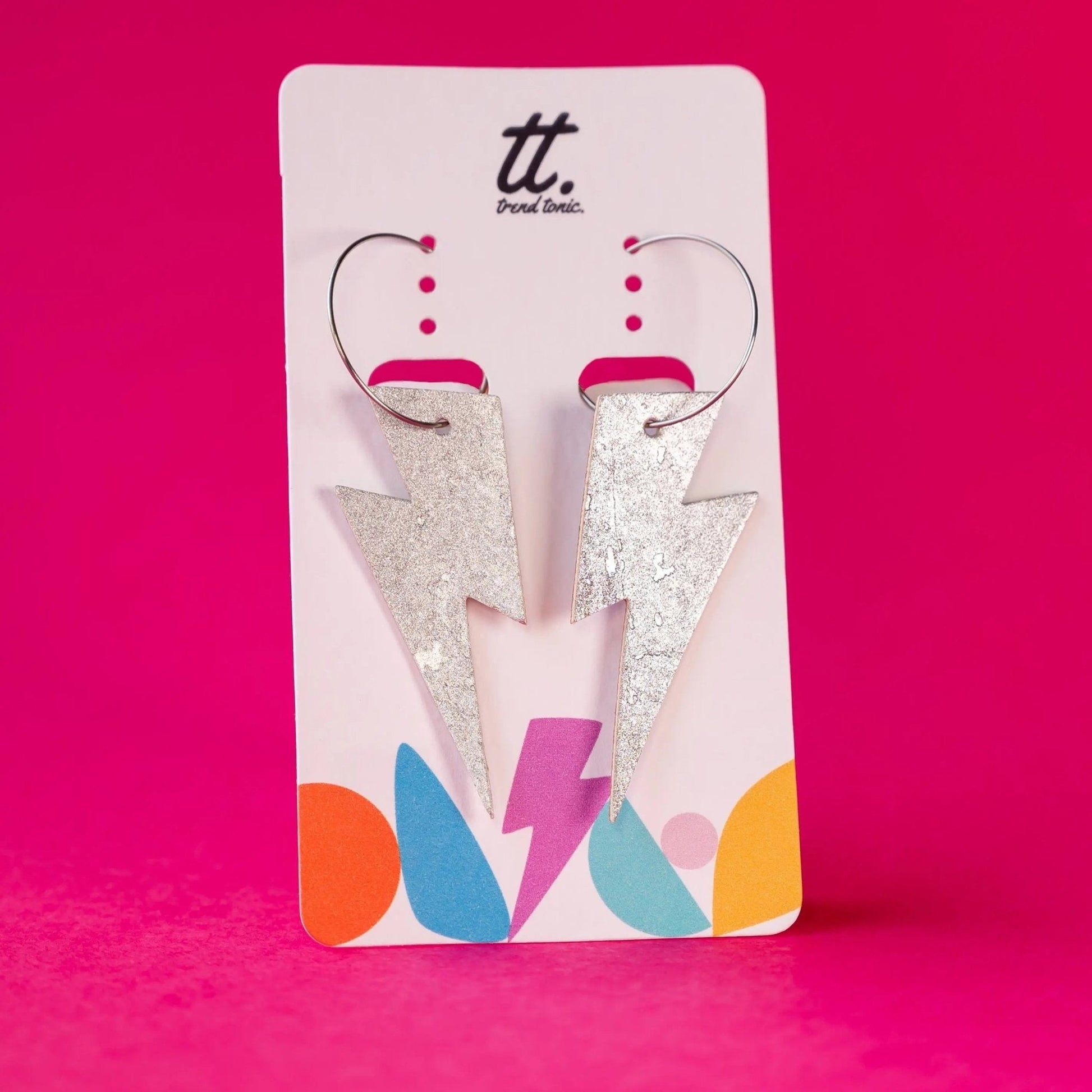 Wear these Metallic silver cork lightning bolt hoop earrings and be a bolt out of the blue! They’re made with cork and hypoallergenic stainless steel, making them lightweight and comfortable for all-day wear. Plus, their cork material is eco-friendly and their 2inch length mounted on 25mm hoops make a serious style statement. Zap into fashion today!