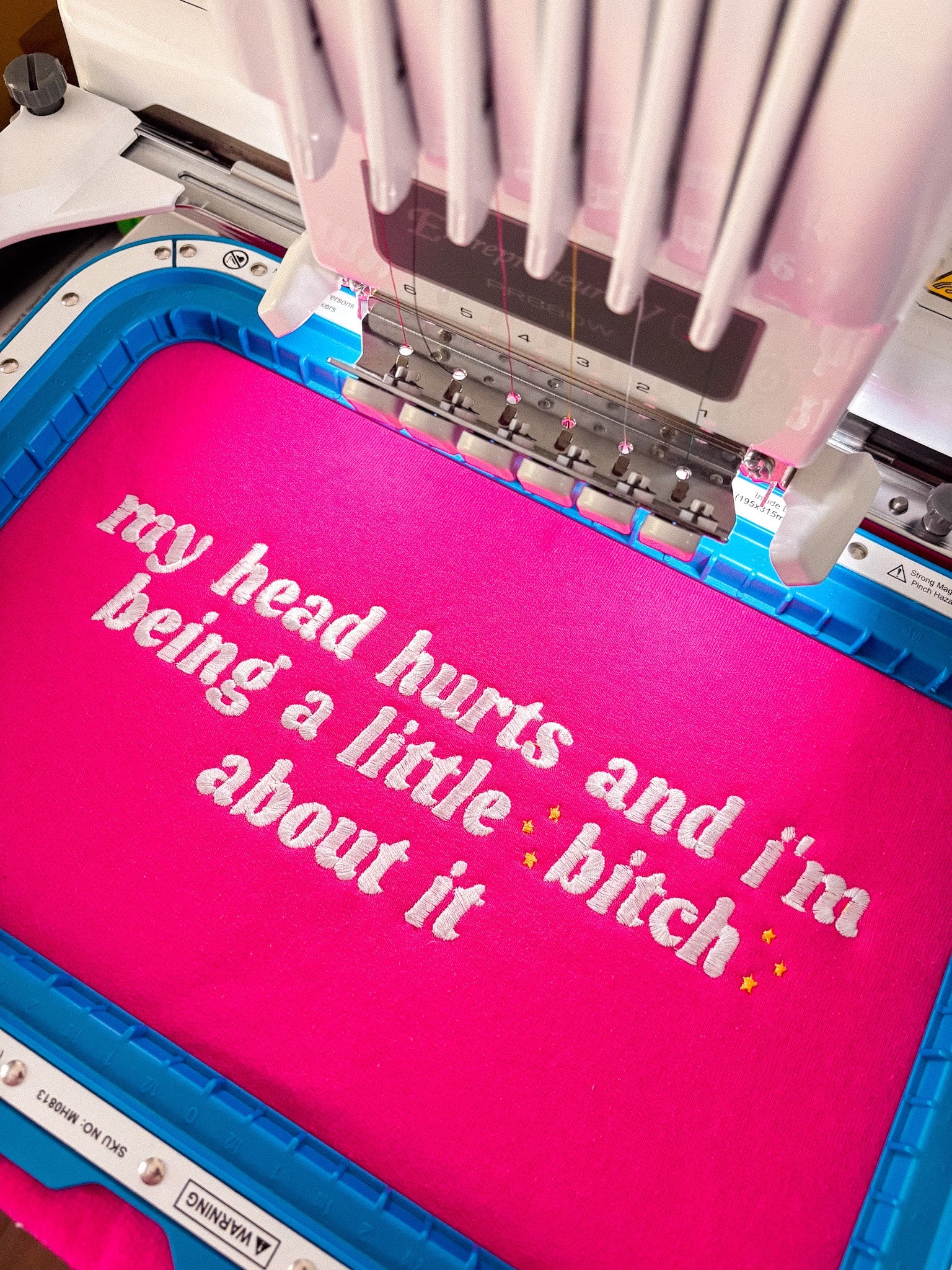 Relatable embroidery - “My Head Hurts (And I’m Being a Little Bitch About It)” stitched to last, so you can wear your truth without saying a word.