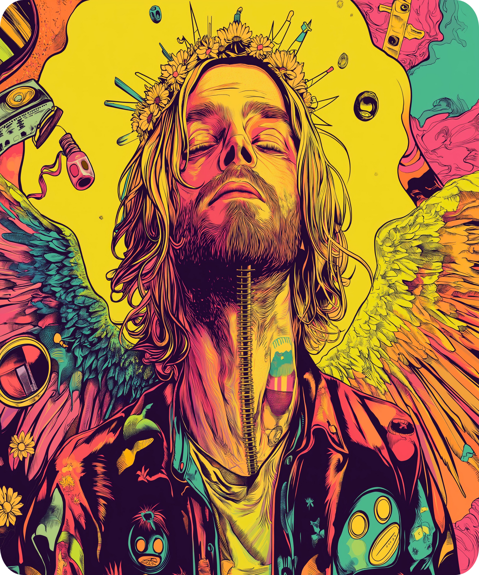 'Kurt Our Saviour' Warped design, evokes nostalgia and introspection with a bright bold colour palette