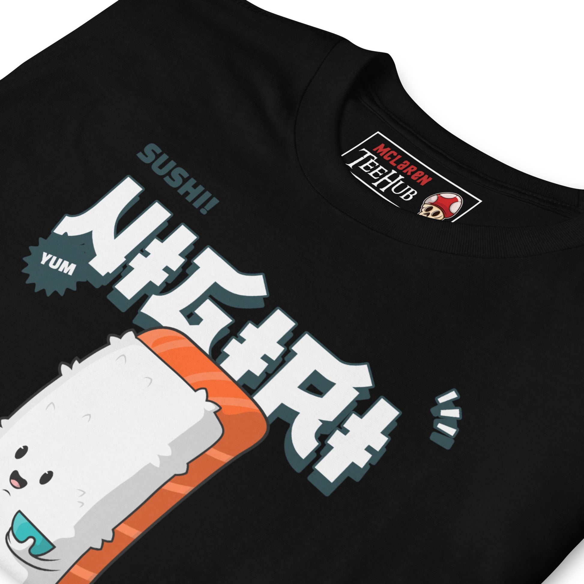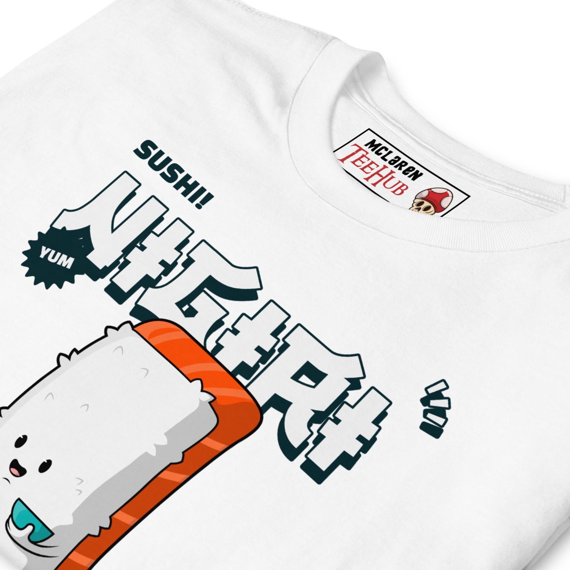 Join the club—the Sushi Lovers Club! This adorable “Nigiri” T-shirt celebrates your love of sushi in the most charming way possible. Featuring a happy little salmon nigiri character with a cheeky smile and the words “Yum” and “SUSHI!” in bold comic-style graphics, it’s perfect for sushi fans who wear their cravings with pride.