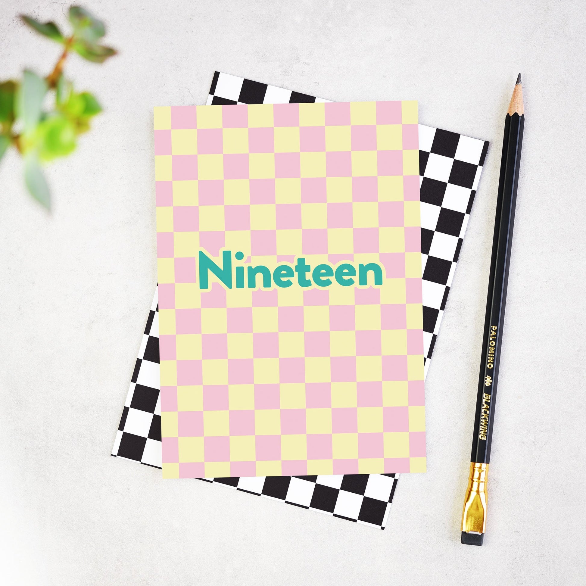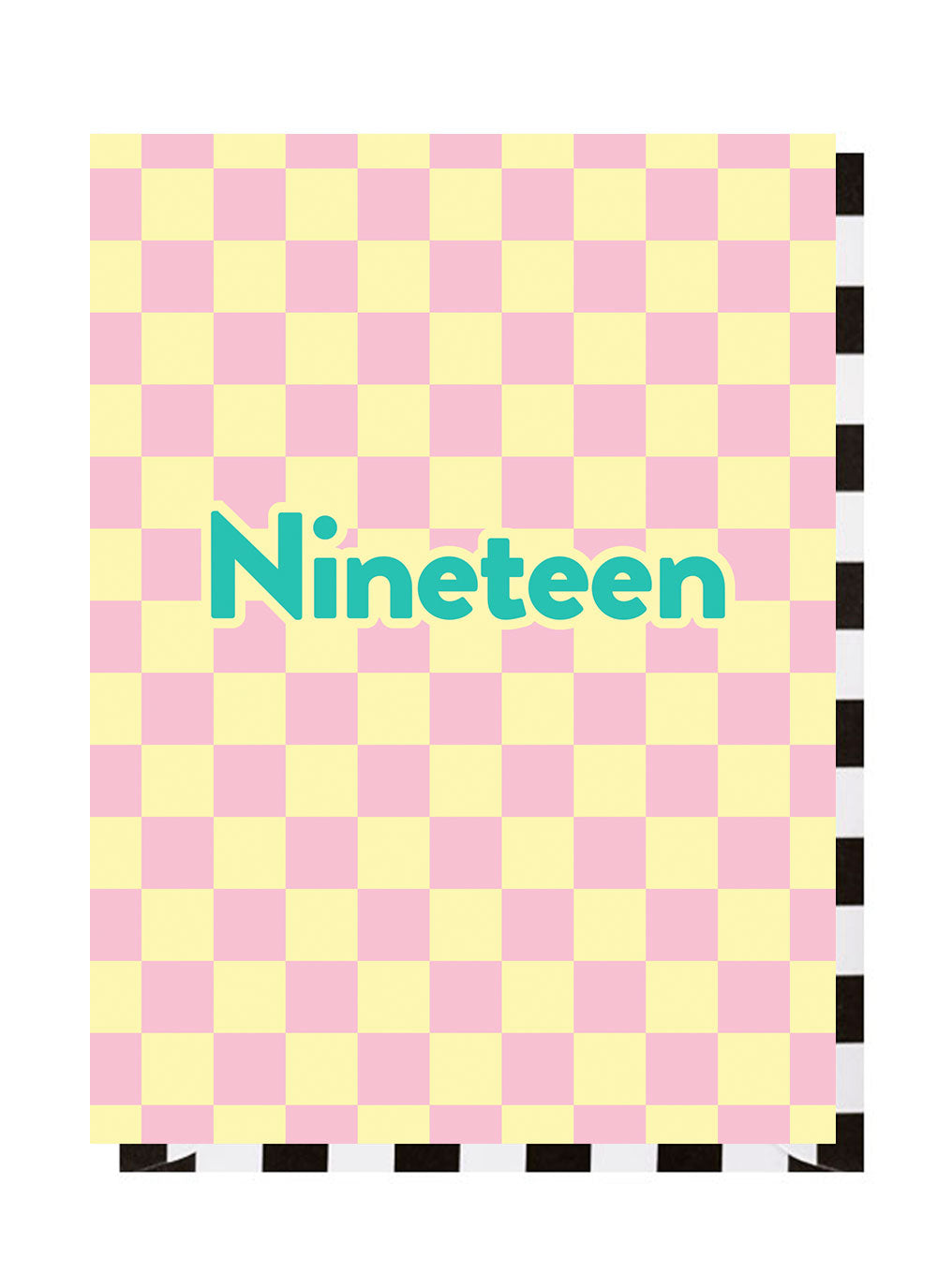 A checkerboard 19th birthday card with the word 'Nineteen' on the front.