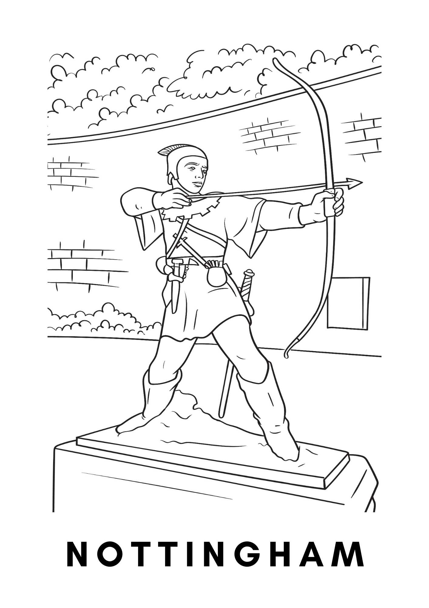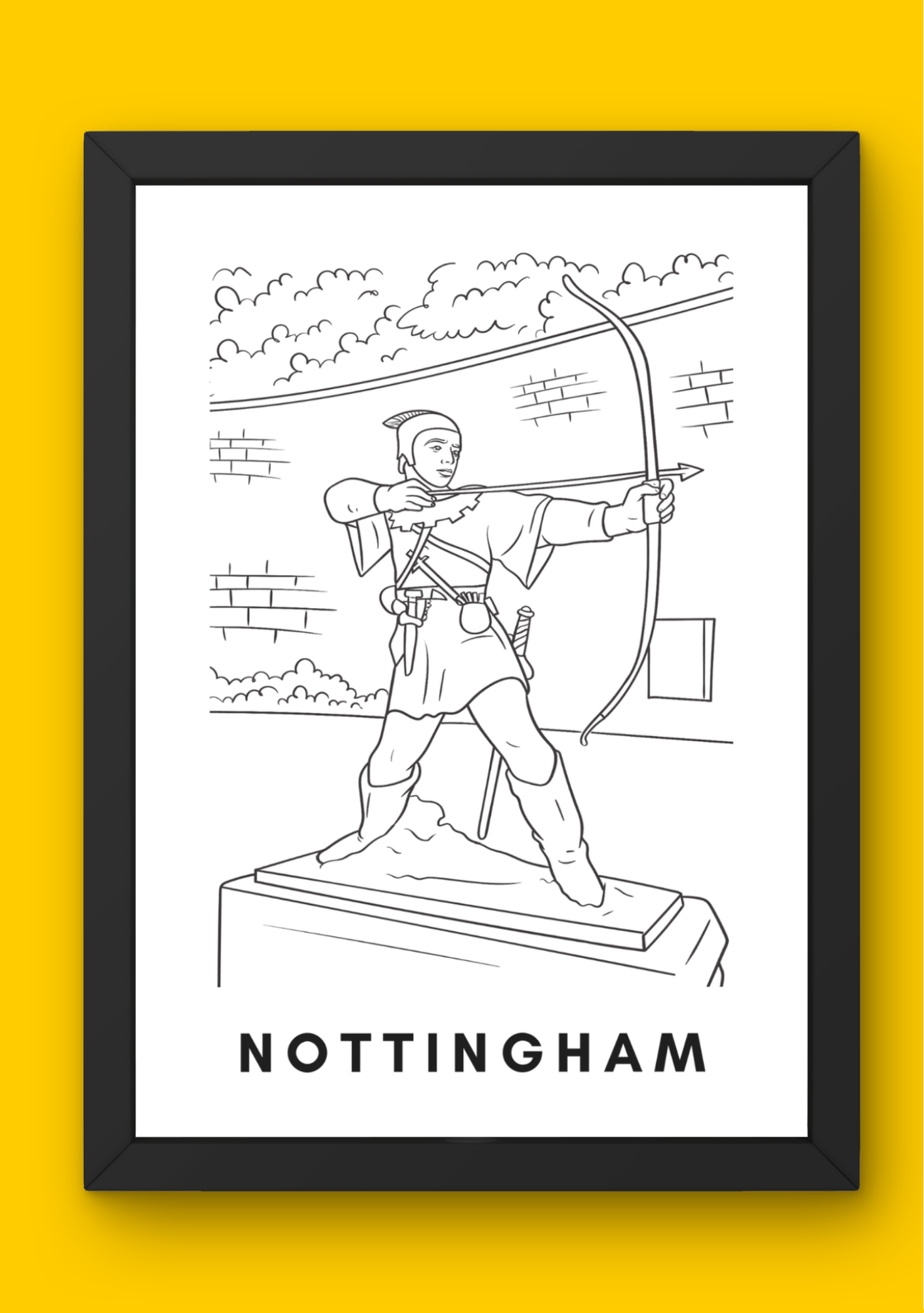 Beautiful wall art / poster of the Robin Hood Statue in Nottingham. The poster can be left as is, or coloured in as preferred.