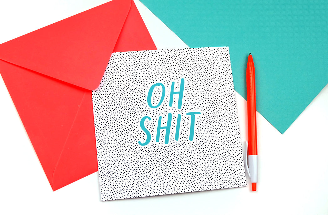 Printed on tip-top quality, FSC-certified 350gsm thick card, the dotty design features the wording 'Oh Shit' in a bold, calligraphic, handwritten style.