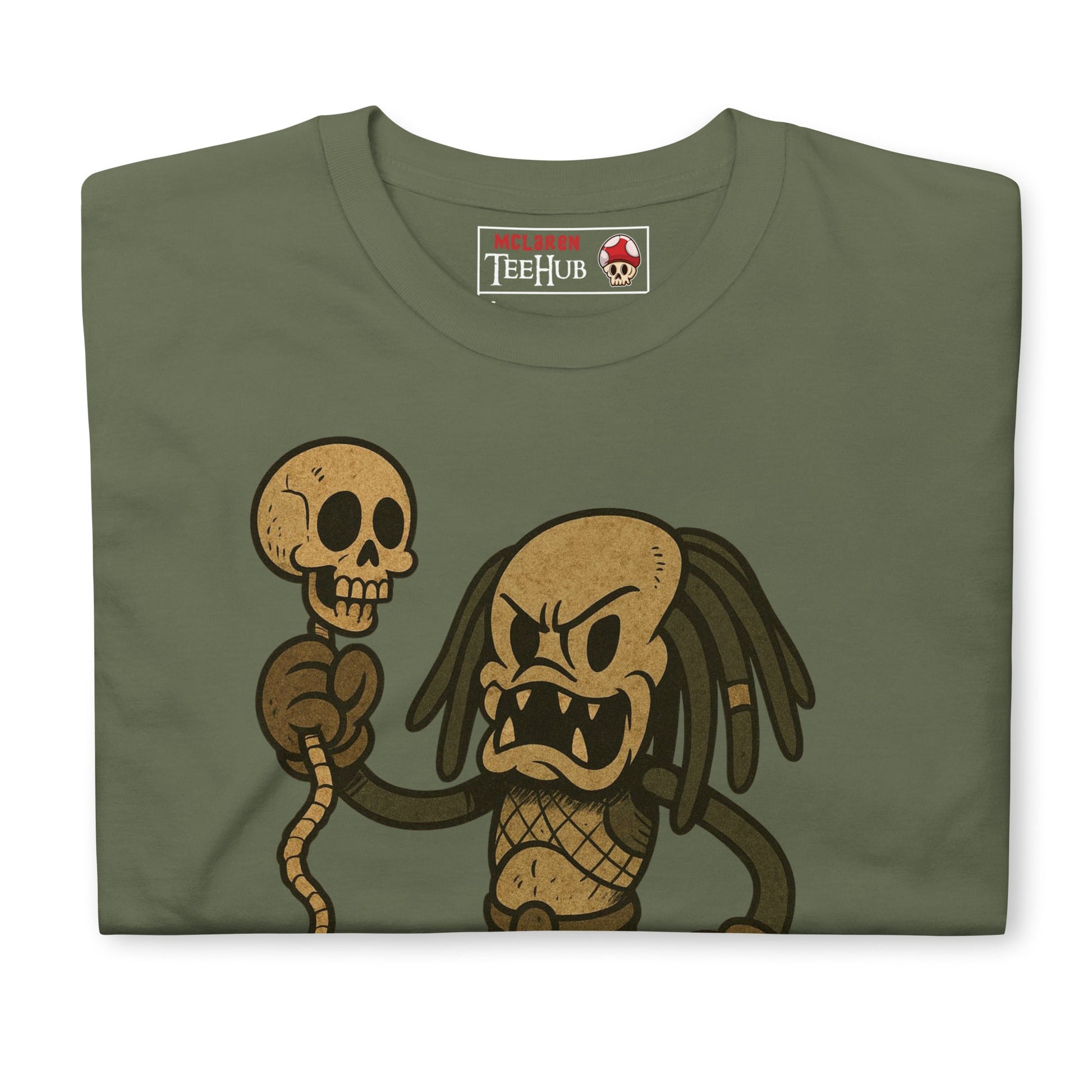 Printed on an olive-green premium tee, this design is perfect for fans of Predator, 80s/90s cult classics, and collectors of unique mashup art. Whether you love sci-fi movies, horror crossovers, or retro cartoon vibes, this shirt is a must-have.