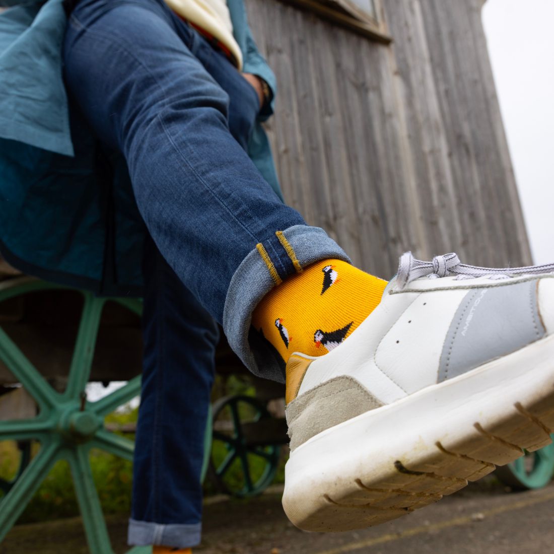 The design of these bamboo socks features a charming image of a puffin bird, set against a yellow background. The puffin graphics are detailed and delightful, making them stand out and catch the eye. These socks are perfect for anyone who loves nature, bird watching, or wants to add a touch of whimsy to their outfit.