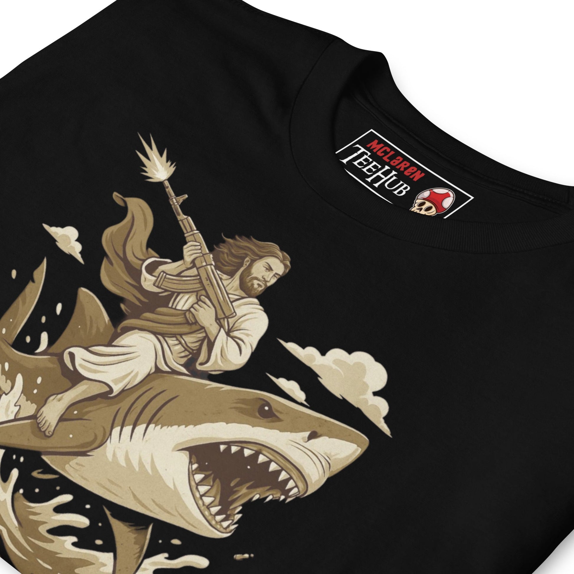 Repent Bitches T-Shirt – Funny Jesus Riding a Shark with Machine Gun Tee