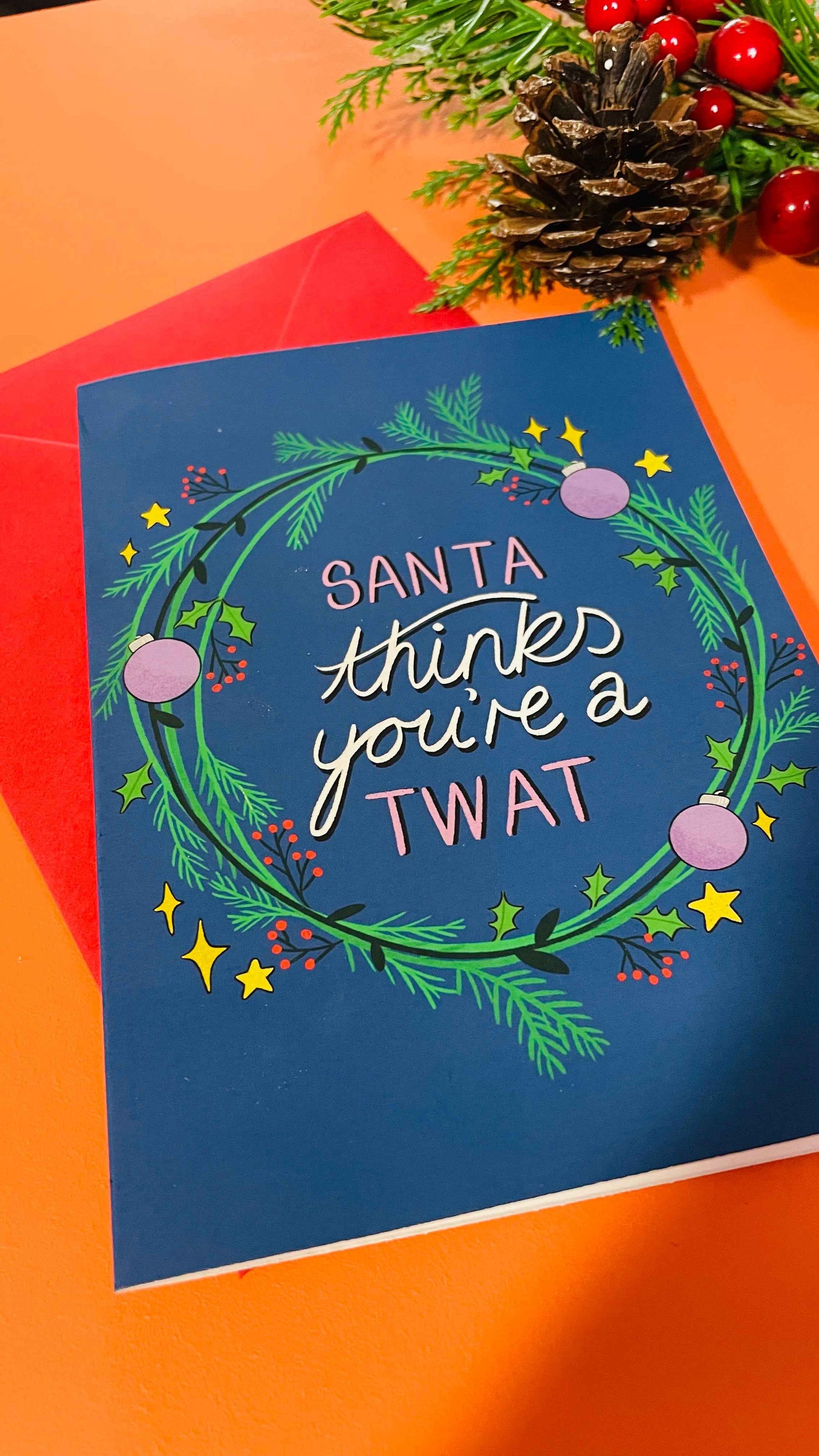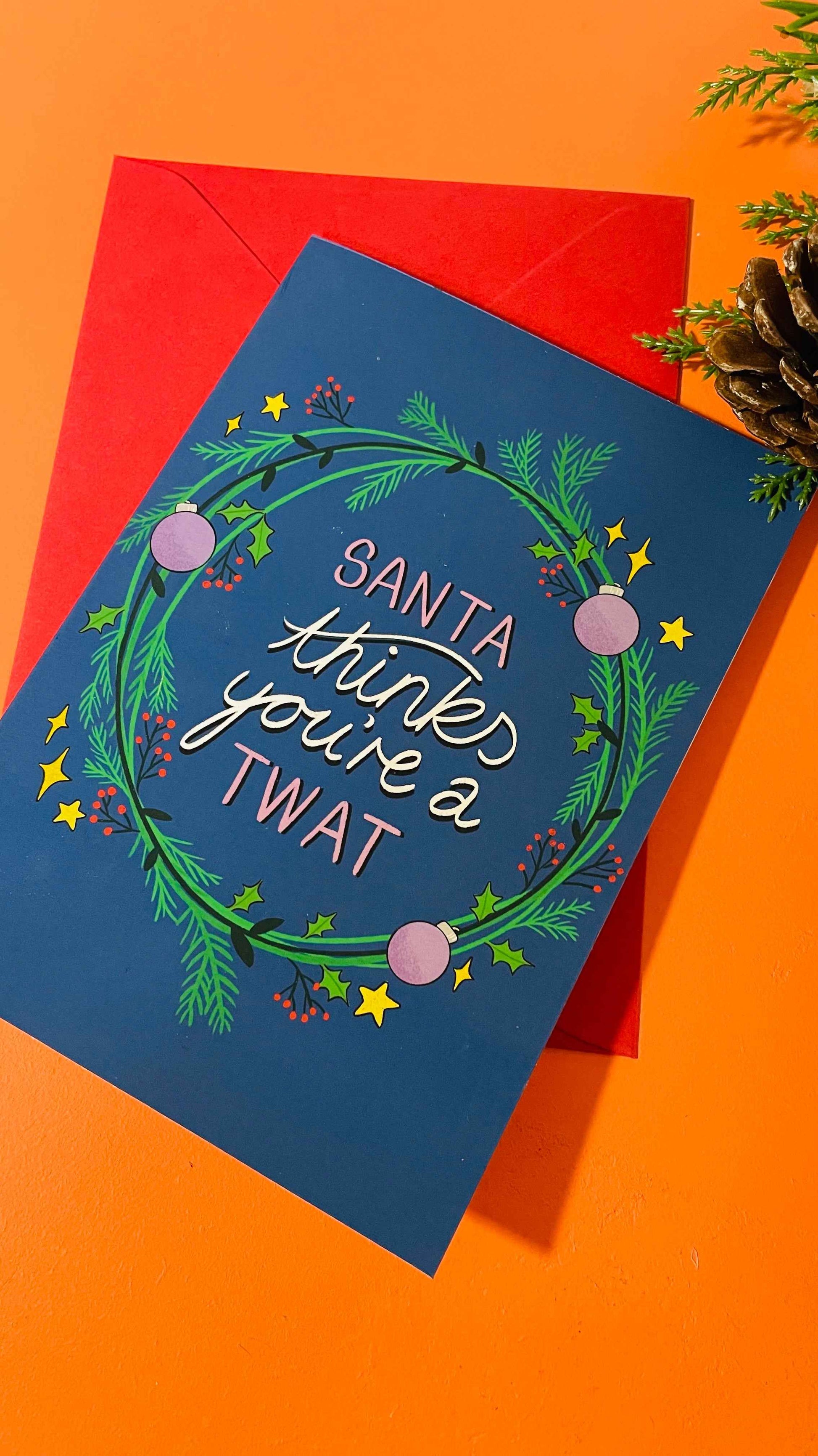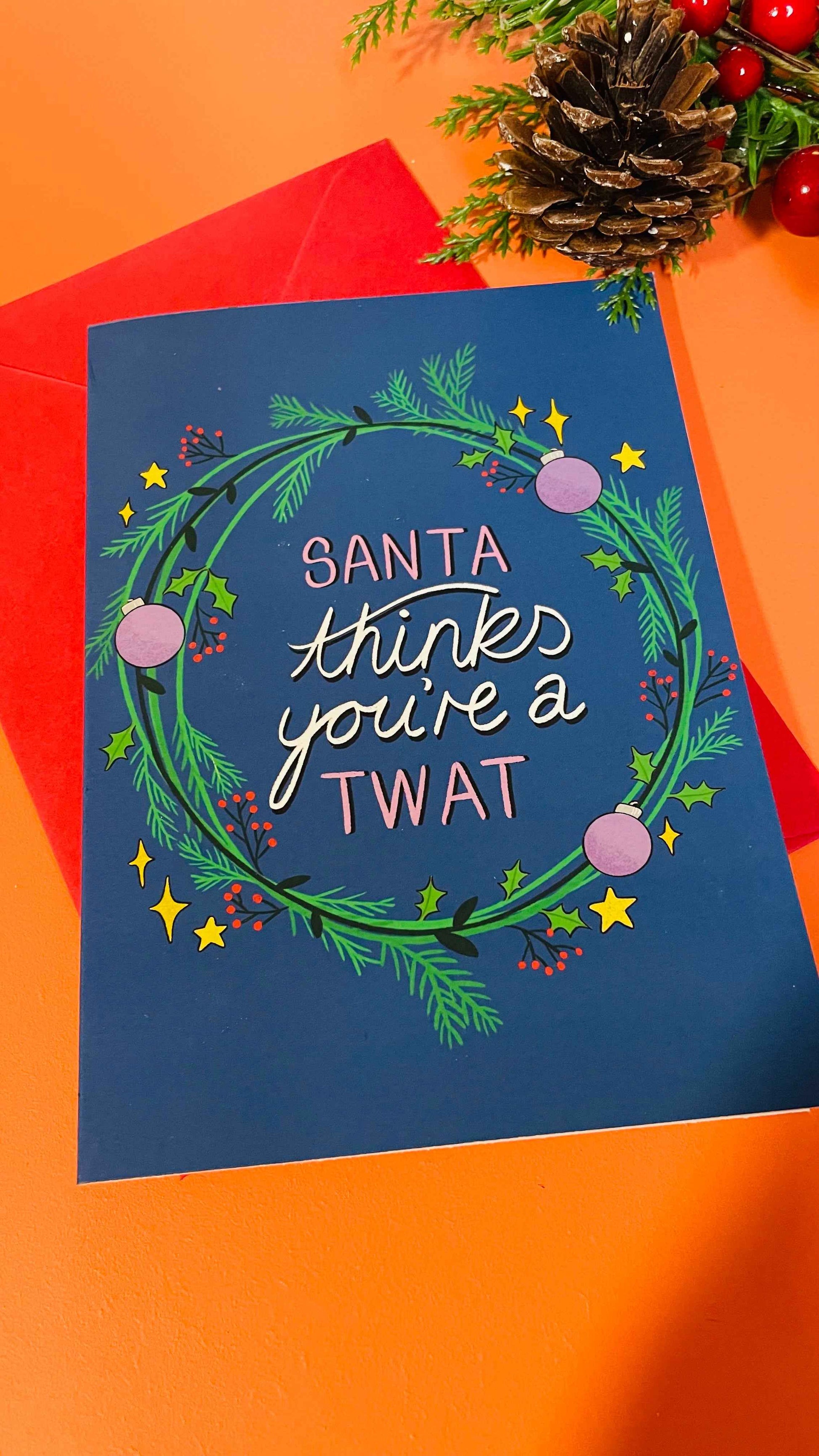 Features the text “Santa thinks you’re a t**t’ surrounded by a festive wreath on a dark blue background.
