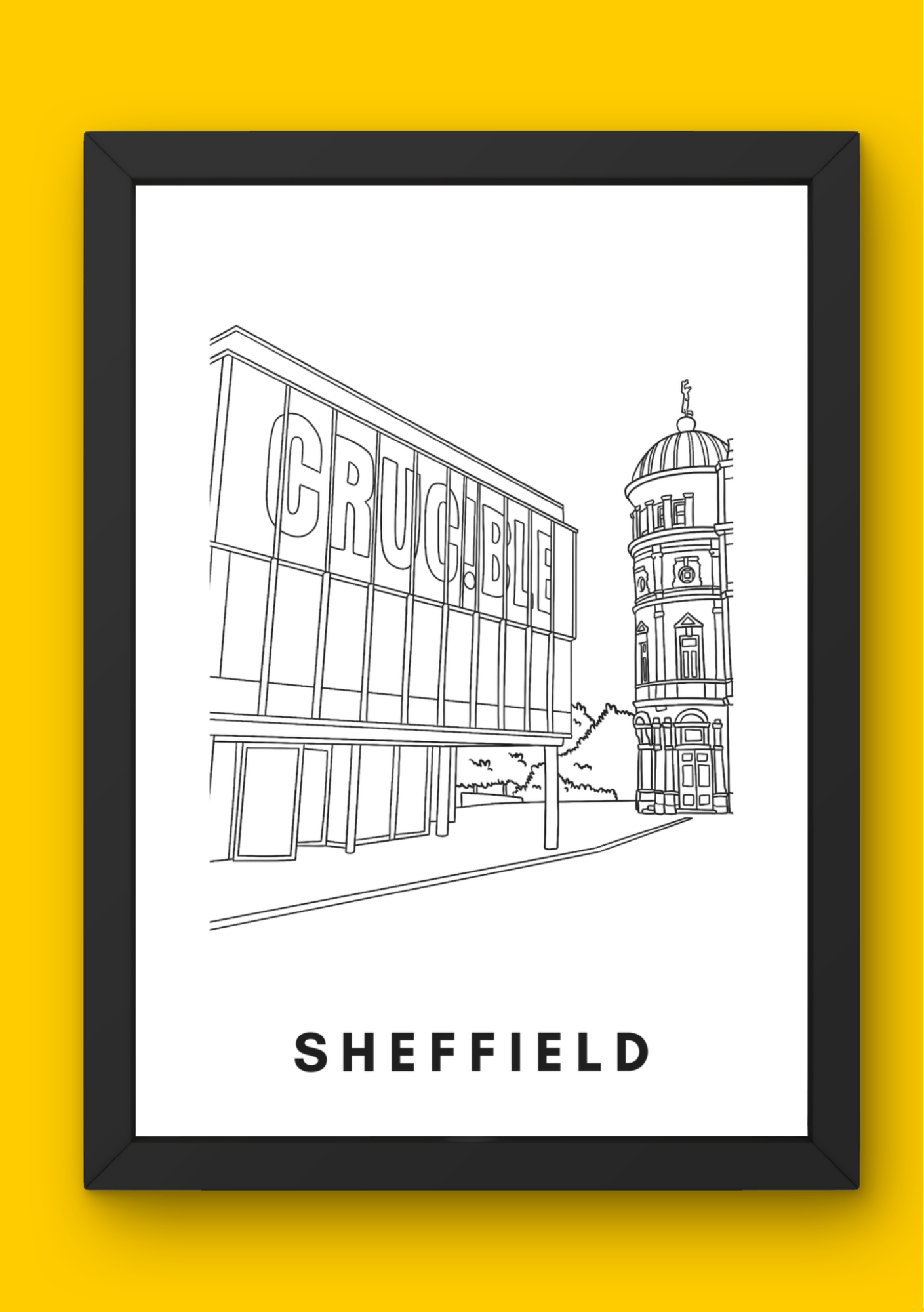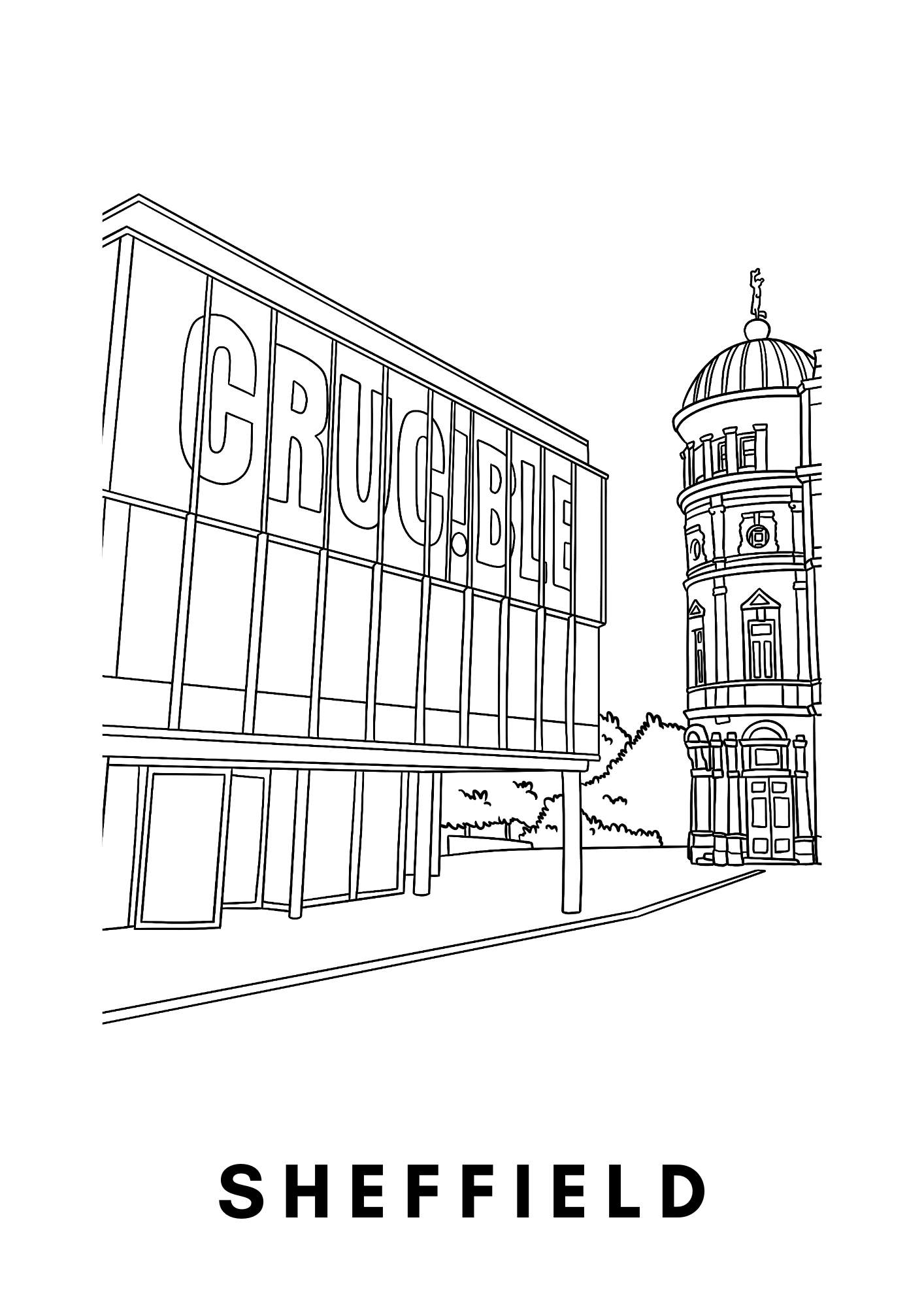 Beautiful wall art / poster of the Crucible in Sheffield. The poster can be left as is, or coloured in as preferred.