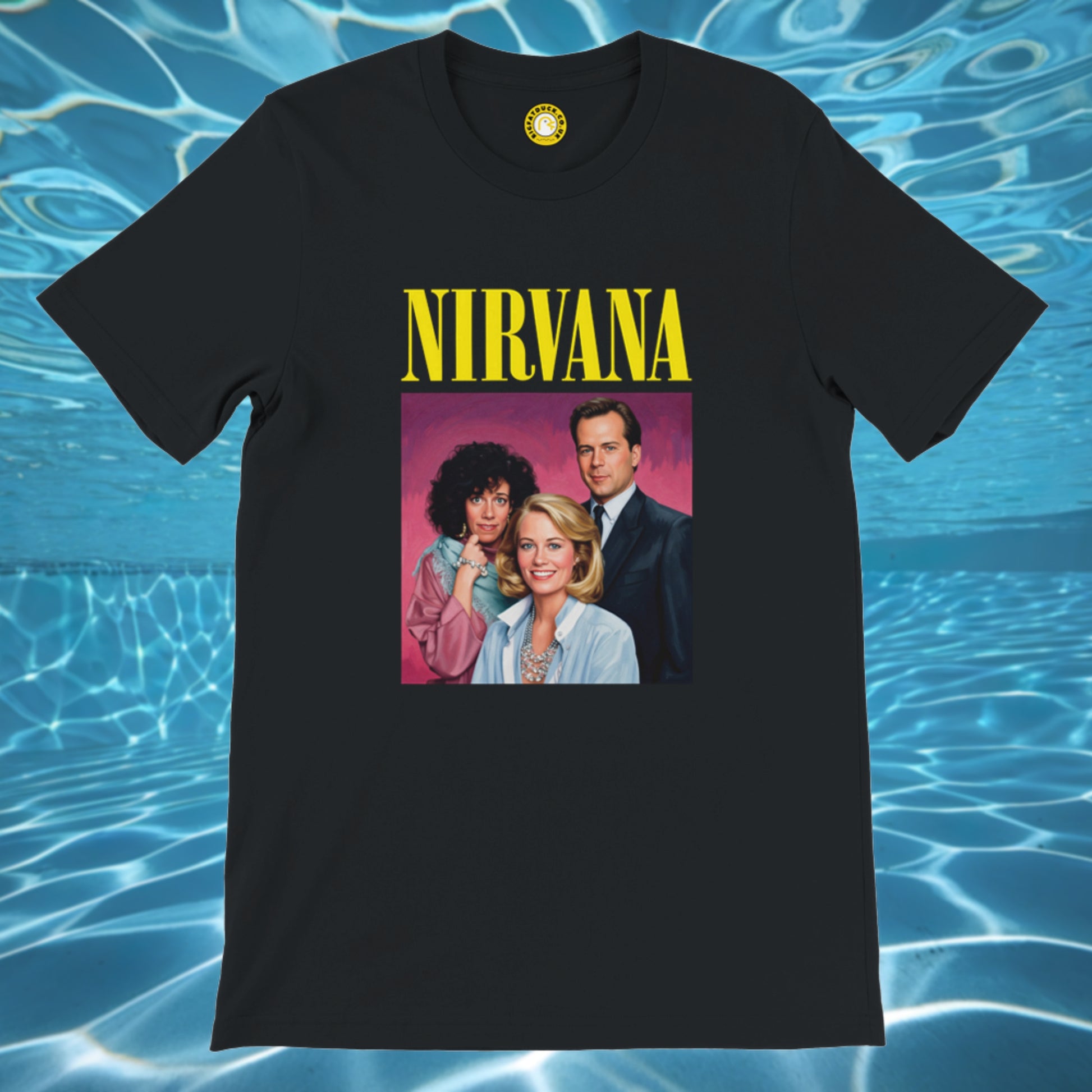 Three familiar faces, one glorious identity crisis. This T-shirt brings Madelyn, David and Agnes together in a portrait that looks suspiciously like it wandered out of a Seattle rehearsal space by mistake. Power suits and peroxide meet thrift-store grunge, with the knowing sense that this is absolutely not an accident. Crowned by lettering borrowed from a much noisier corner of pop culture, the whole thing dares you to spot the joke before it spots you.