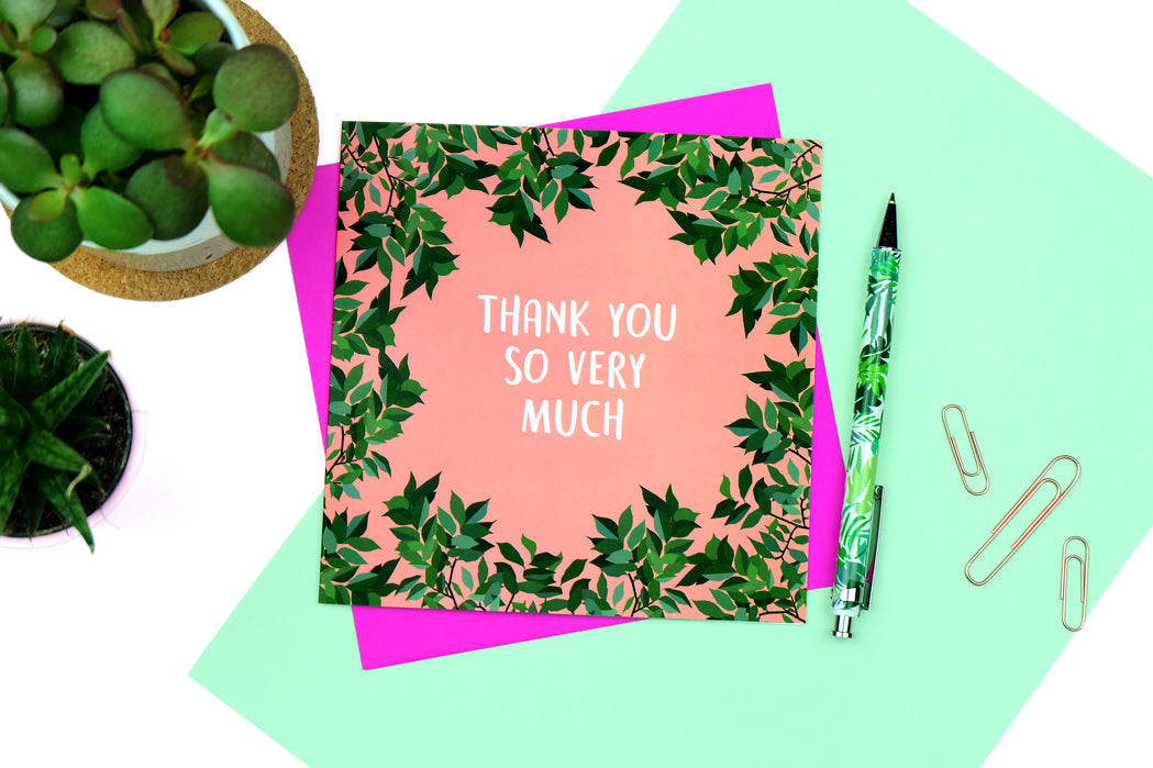 Printed on premium quality, FSC-certified 350gsm thick card, the botanical design features the wording 'Thank You So Very Much' in the centre.