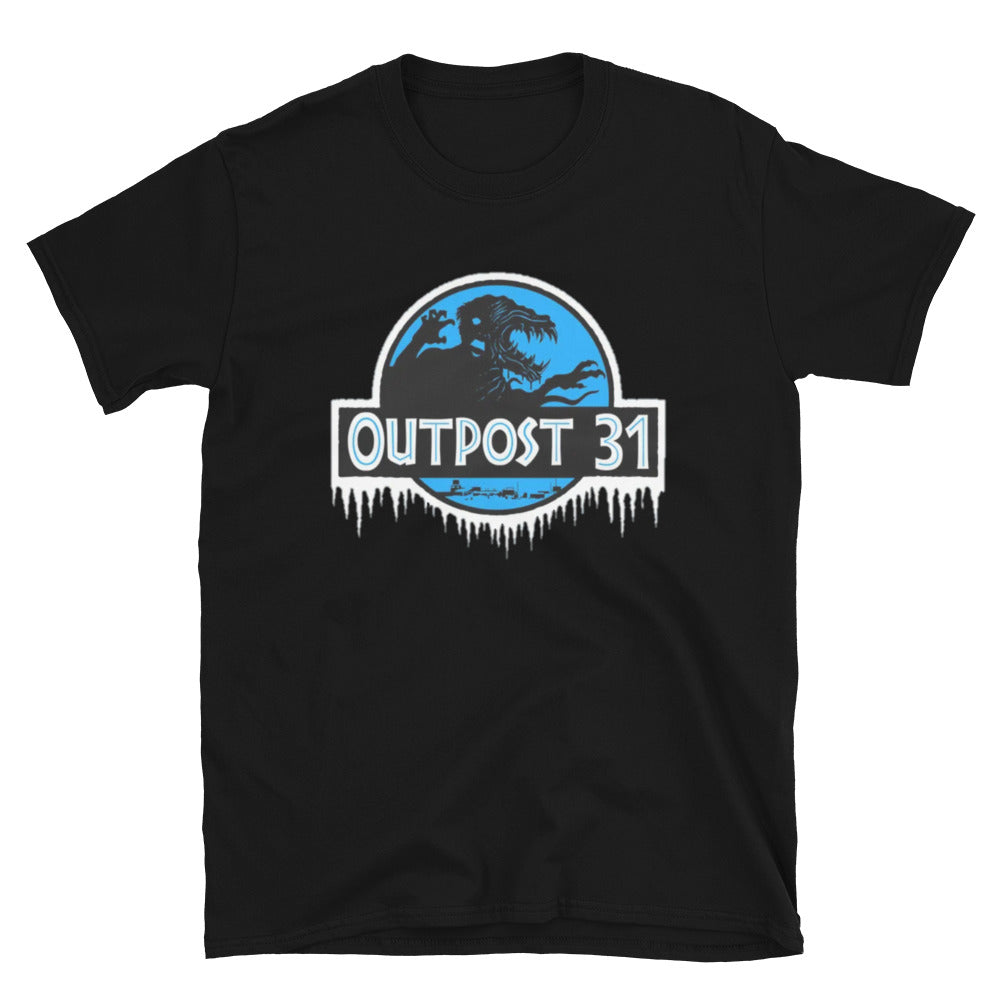 Show off your love for classic horror and sci-fi with this unique T-shirt that combines the iconic Jurassic Park logo style with a chilling twist. Featuring the monster from The Thing and the wording 'Outpost 31,' this shirt is perfect for fans of John Carpenter's masterpiece and those who appreciate memorable movie references. Ideal for casual outings, movie nights, or as a standout piece in your collection, this Outpost 31 T-shirt is a must-have for any horror and sci-fi enthusiast looking to make a bold statement!.