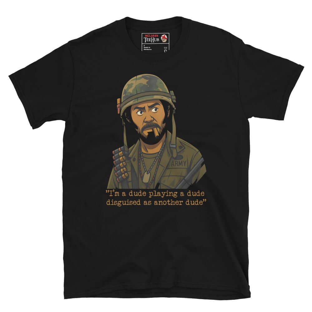 Step into a hilarious meta-moment with this "I'm a dude playing a dude disguised as another dude" tee inspired by Tropic Thunder. Perfect for fans of the iconic film and its unforgettable characters, this shirt features a bold, cartoon-style design of the character Kirk Lazarus. Made from soft, high-quality fabric, it's comfortable enough for everyday wear or your next movie night. Show off your love for comedy, satire, and classic lines with this must-have addition to your collection.