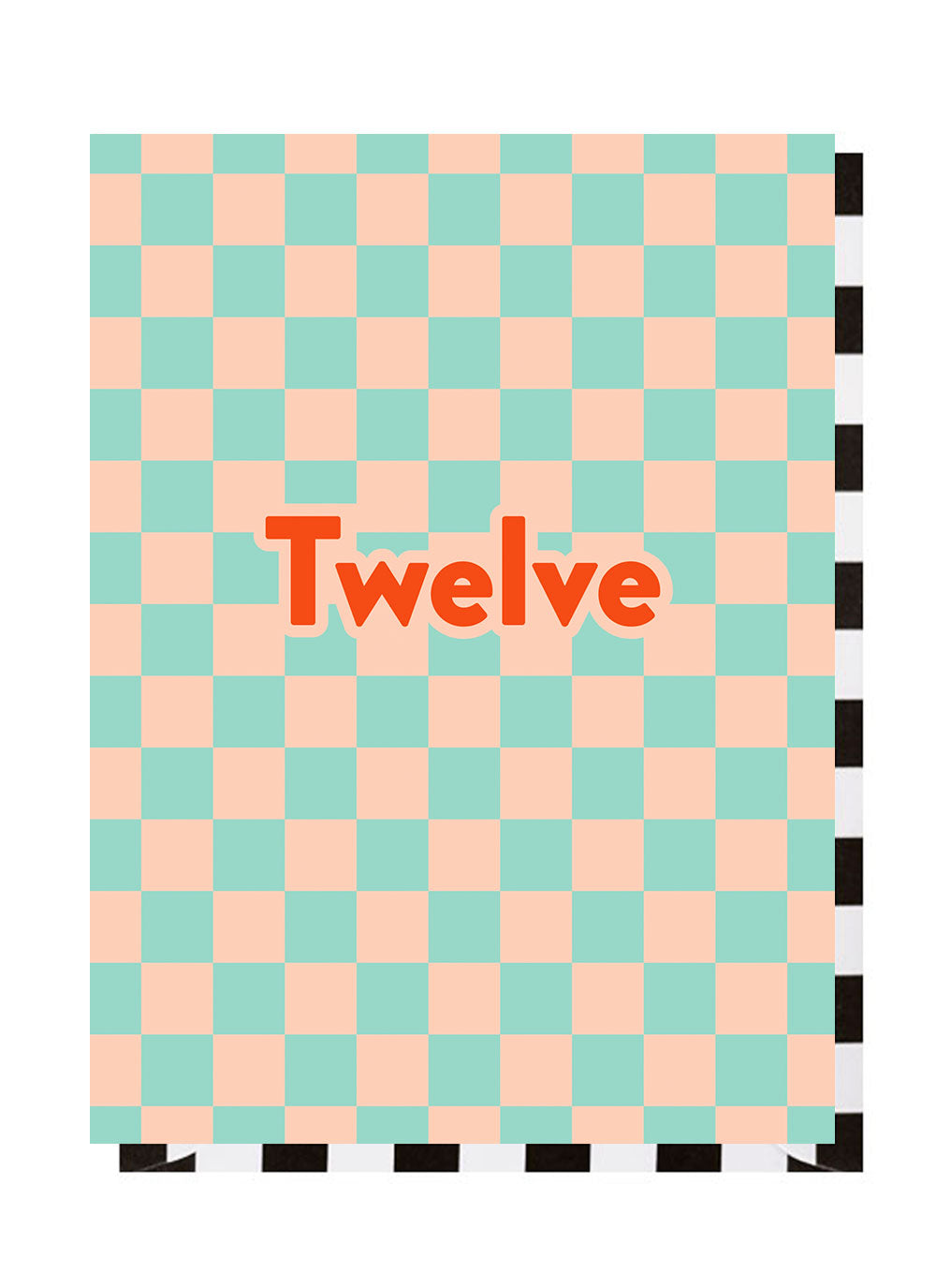 A fun checkerboard 12th birthday card with the word 'Twelve' on the front.
