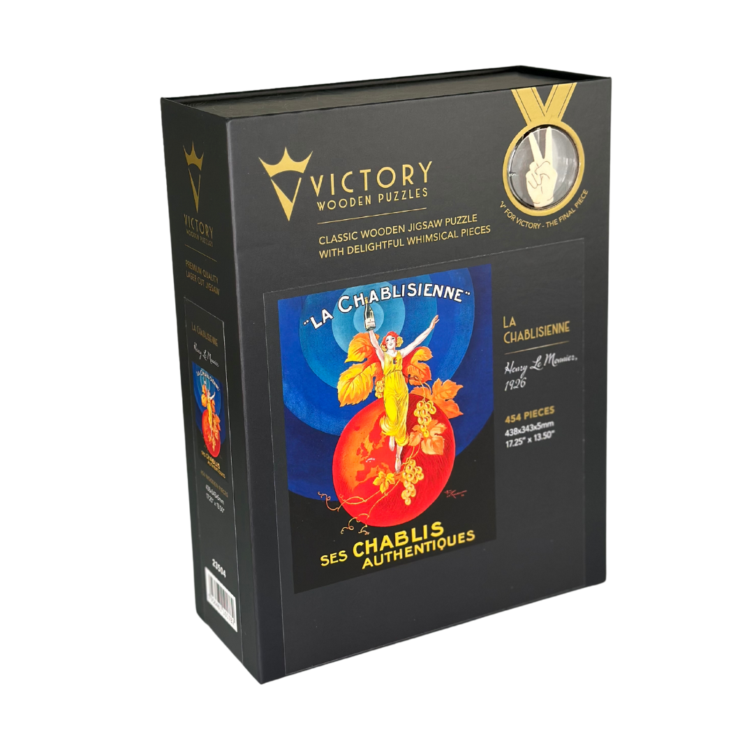 With 454 irregular and whimsical-shaped pieces, this 5mm plywood wooden puzzle showcases a vintage advertising poster from the famous French vineyard in beautiful Chablis, France. Perfect for wine lovers and puzzle enthusiasts alike, this puzzle is a delightful blend of art and entertainment.