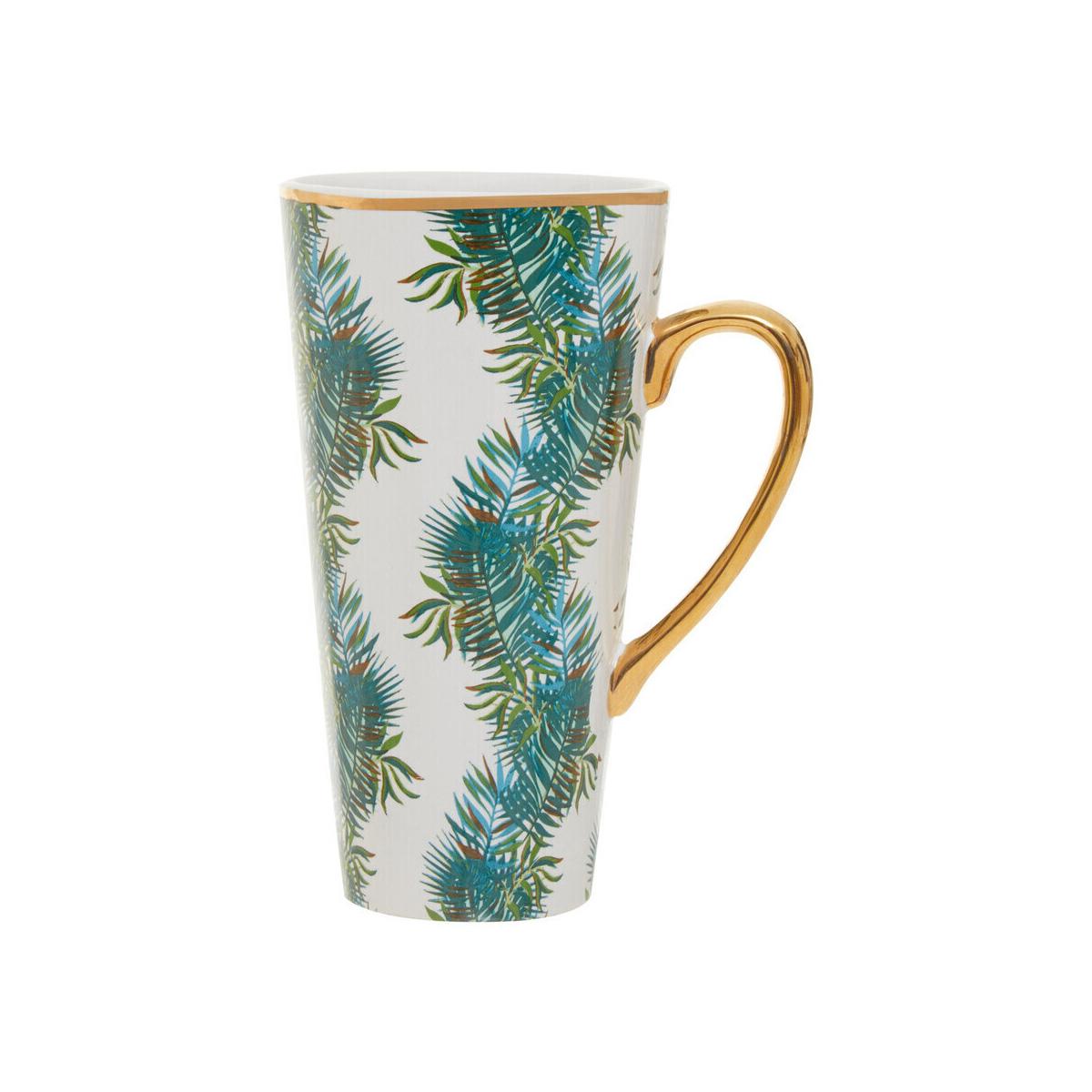 The Winter Palm latte mug is contemporary and sleek. Both the rim of the mug and handle are coated in a luxurious gold, which complements the palm pattern. The green leaves print against white background add a tropical charm to the overall look.