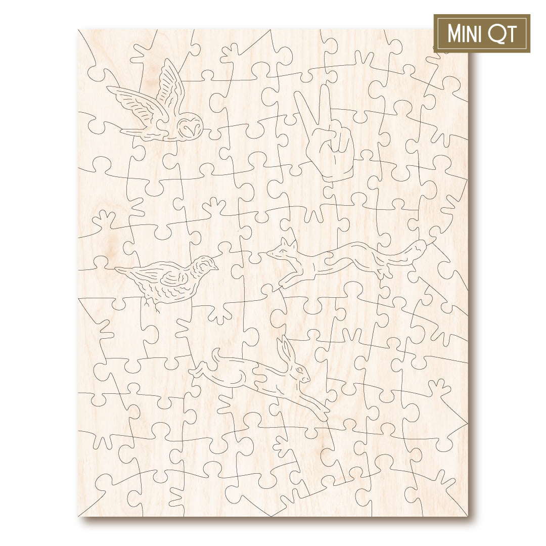 Our MINI QT puzzles are laser cut from thick, 4mm plywood and include 5 whimsies - they make a great puzzle snack!