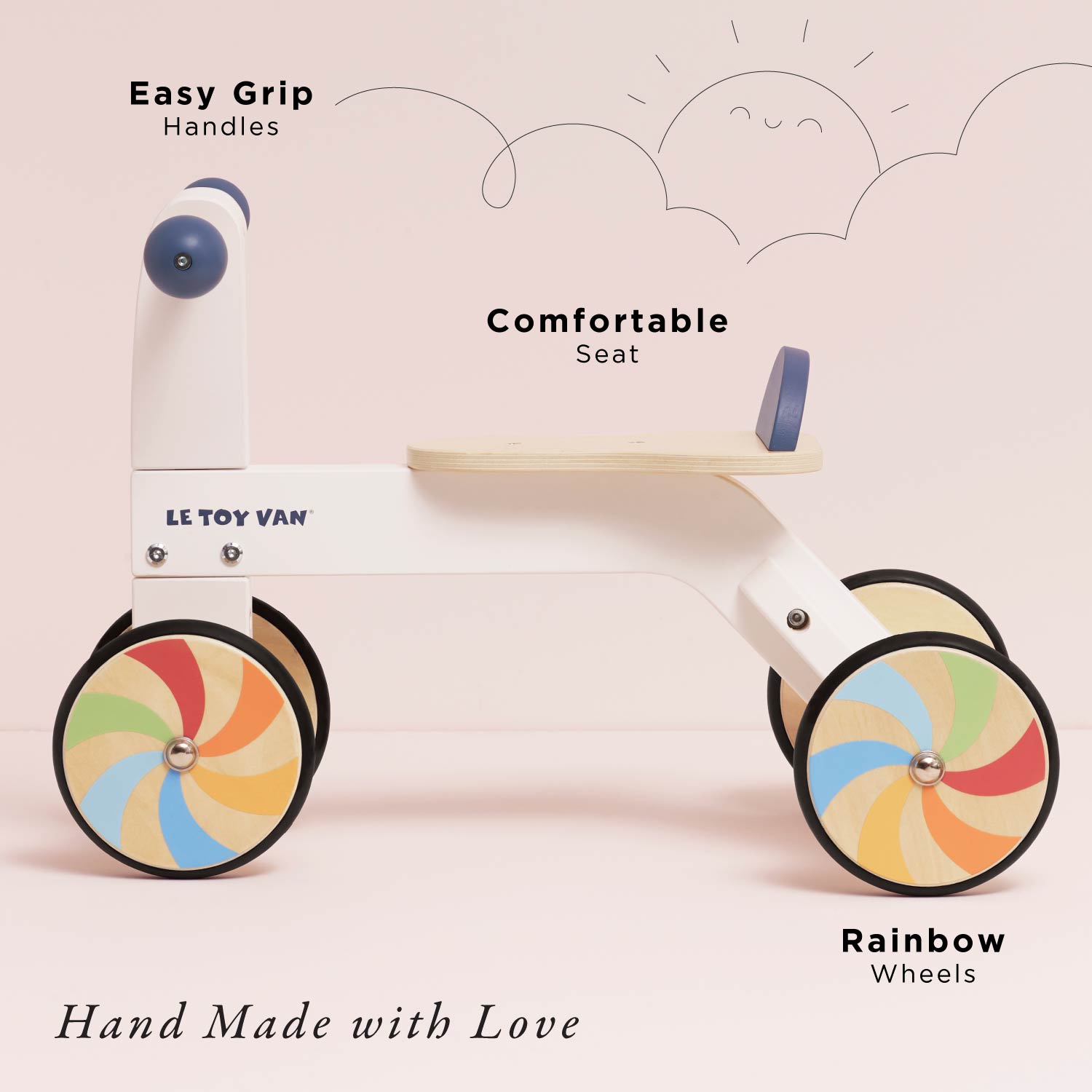 Made from FSC®-certified wood, this beautifully designed Wooden Trike features a sleek white and dark blue finish with go-faster colourful windmill wheels, this ride-on adds a playful touch to every journey. Designed for comfort and control, it features a comfortable seat and easy-to-steer handlebars, making it perfect for little explorers. This stylish ride-on encourages active play while helping to develop balance and coordination.
