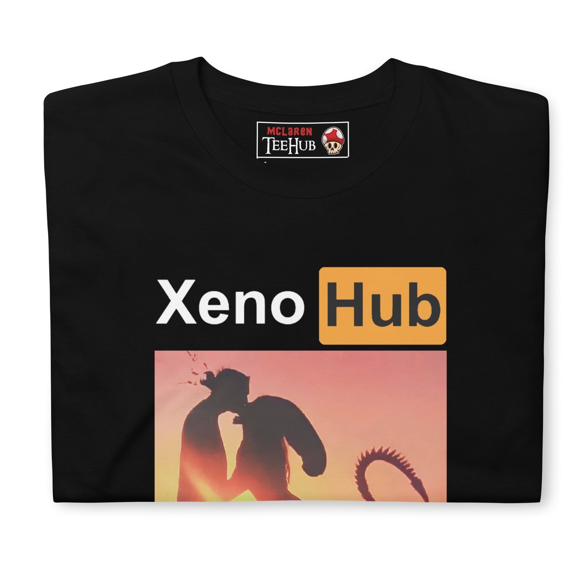 Discover the 'XenoHub' T-shirt, a unique crossover blending the iconic Aliens franchise with a playful nod to adult entertainment. Perfect for sci-fi fans with a sense of humor, this eye-catching design makes a bold statement. Show off your love for Xenomorphs and stand out with this fun and edgy T-shirt!