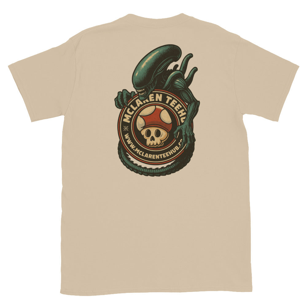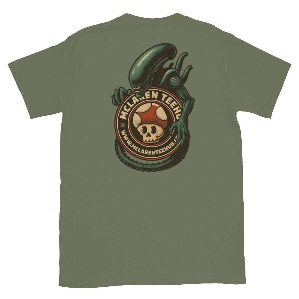 Unleash sci-fi terror with streetwear swagger in our Xenomorph Logo Tee! This military green T-shirt features a bold, Alien-inspired creature coiled menacingly around the McLaren Tee Hub logo — a mushroom-skull hybrid that screams underground rebellion and interstellar dread.