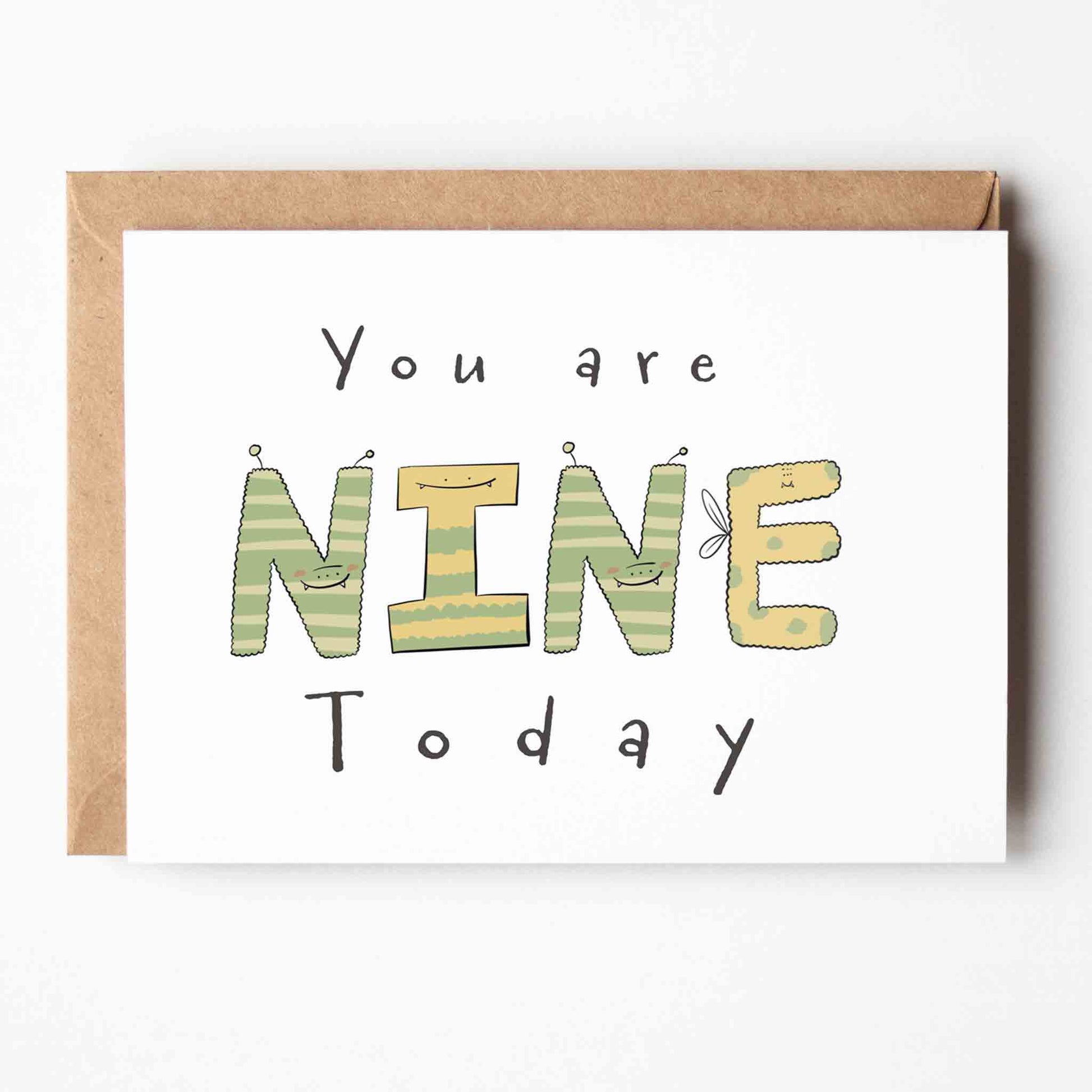 Nine and feeling kawaii fine! This cheerful birthday card features a gang of monster-shaped letters spelling out "NINE" with maximum adorable charm! (◕‿◕)🎂
