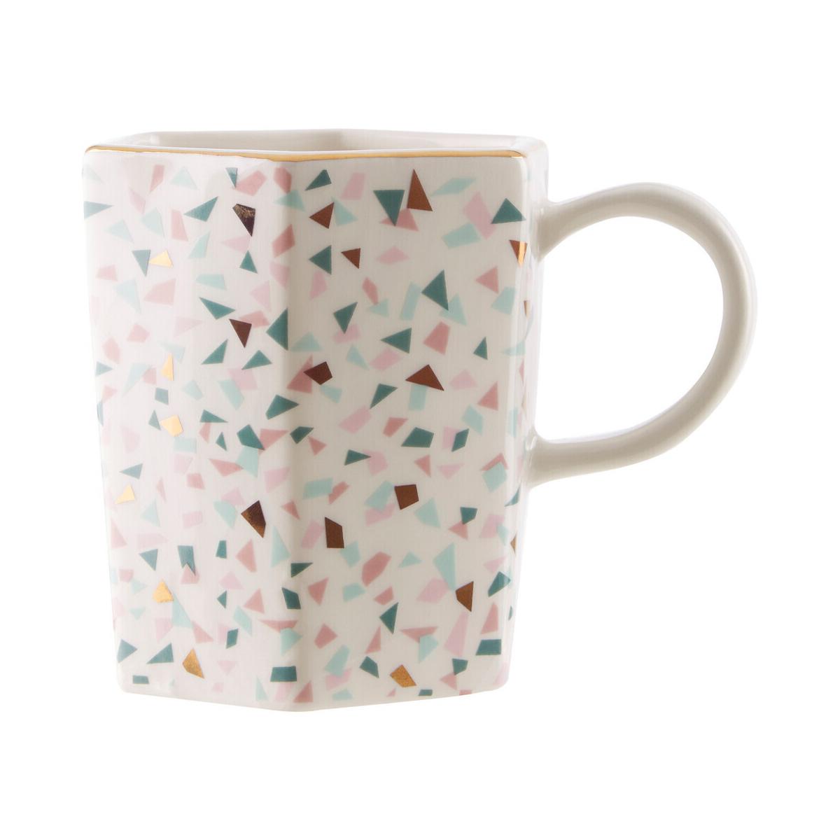 Made from robust dolomite, this mug features a soft white ceramic finish and decorated with assorted flecks to form a terrazzo pattern. A curved, easy to grip handle provides a secure hold when taking sips of the hot brew. The warm gold finish rim creates a minimal luxurious appeal contrasting its muted base.